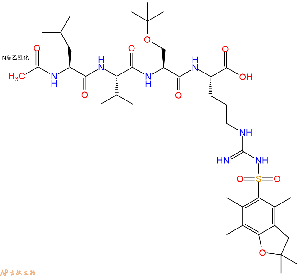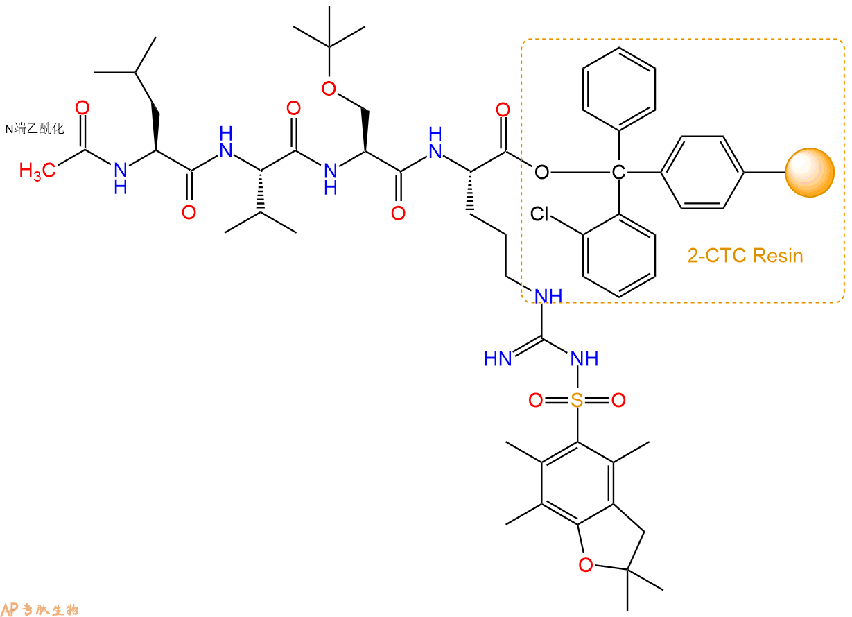 5、乙酸酐反应连接:在上述树脂中,加入适当DMF后,再加入4.35mmol 乙酸酐到树脂中,再加入8.7mmol DIPEA、4.13mmol HBTU,鼓氮气反应30分钟。用2倍树脂体积的DMF 洗涤3次树脂(洗涤树脂,去掉残留溶剂,为下一步反应做准备)。 得到Ac-Leu-Val-Ser(tBu)-Arg(Pbf)-CTC Resin。 结构如下: