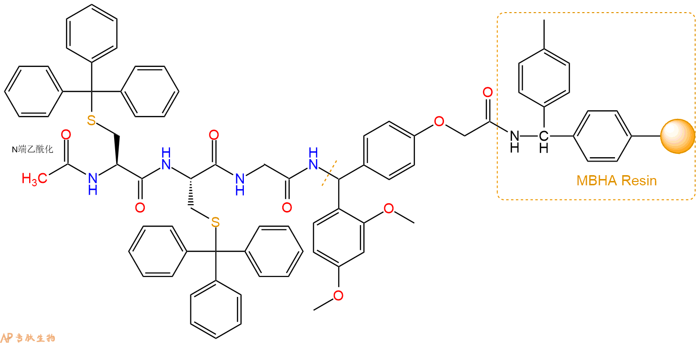 5、乙酸酐反应连接:在上述树脂中,加入适当DMF后,再加入1.46mmol乙酸酐到树脂中,再加入2.92mmol DIPEA,鼓氮气反应30分钟。用2倍树脂体积的DMF 洗涤3次树脂(洗涤树脂,去掉残留溶剂,为下一步反应做准备)。 得到Ac-Cys(Trt)-Cys(Trt)-Gly-Linker-MBHAResin。 结构如下: