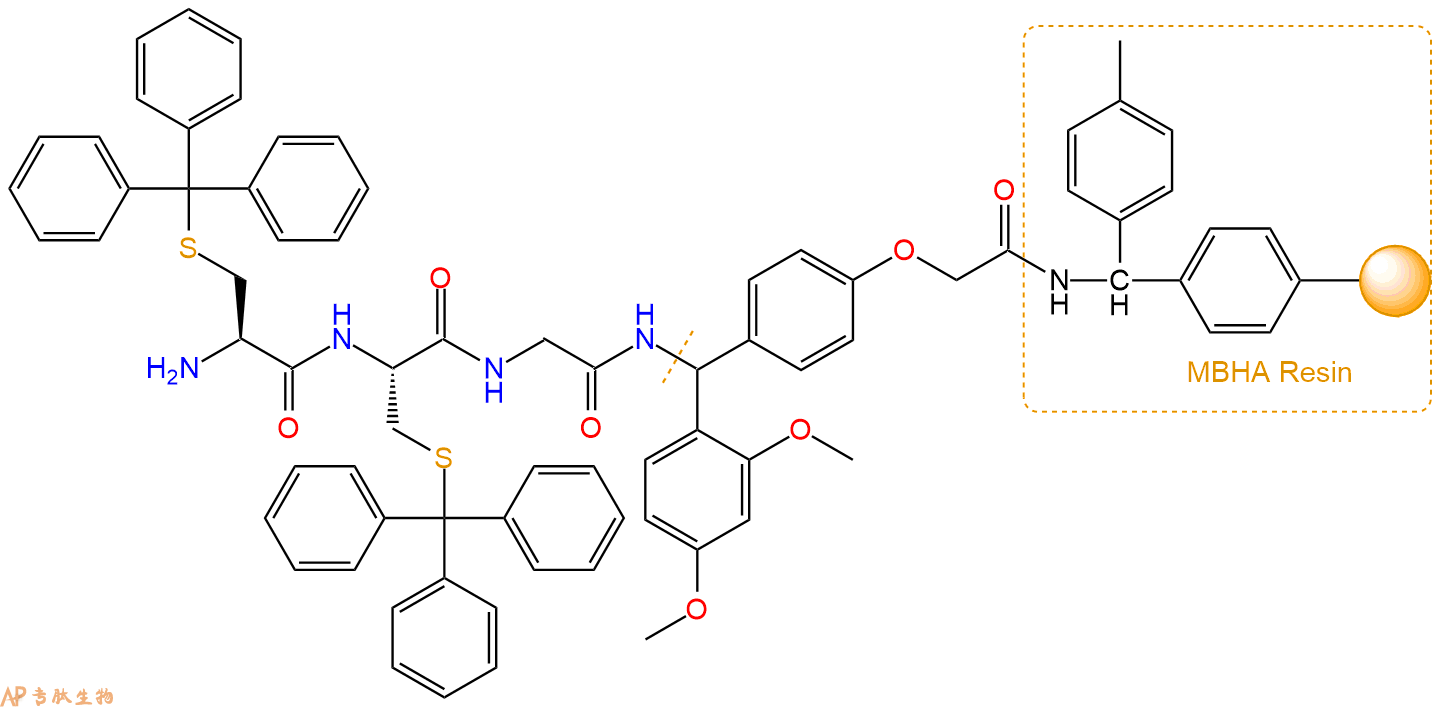 最后再经过步骤二得到 H2N-Cys(Trt)-Cys(Trt)-Gly-Linker-MBHA Resin,结构如下: