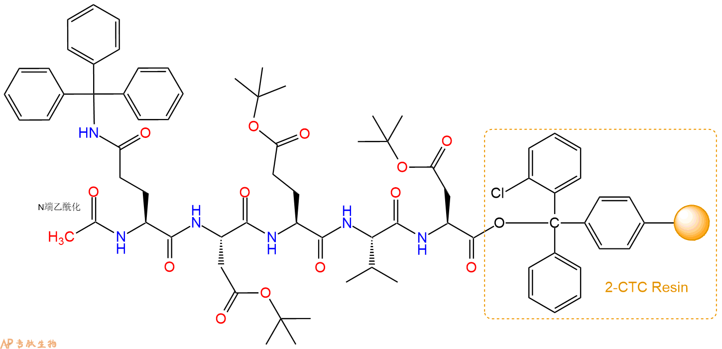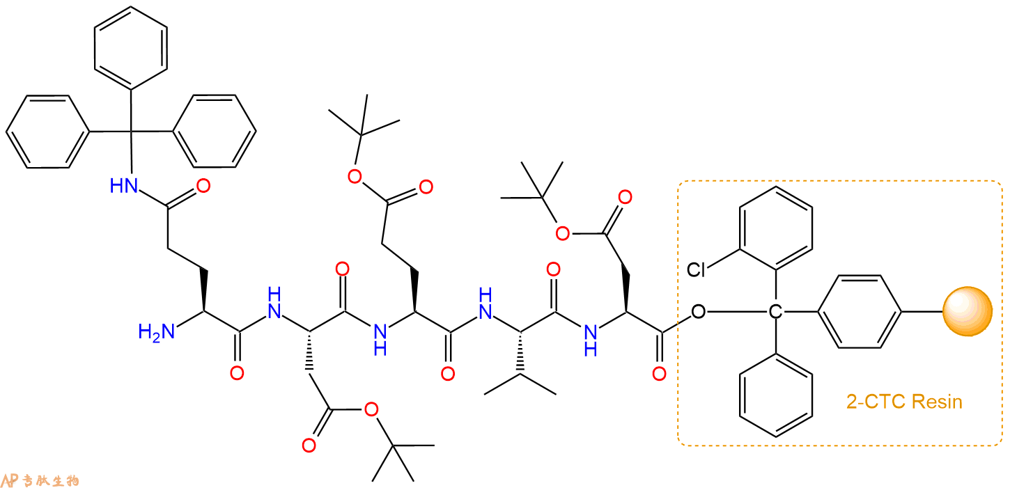 最后再经过步骤二得到 H2N-Gln(Trt)-Asp(OtBu)-Glu(OtBu)-Val-Asp(OtBu)-CTC Resin,结构如下:
