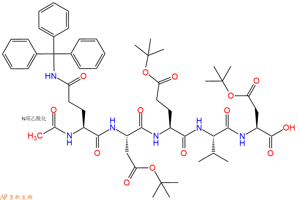 6、全保护切割:配置0.5%TFA/DCM溶液,溶液体积约为树脂体积的3倍。再次用DCM洗涤树脂2遍(去除残留DMF),后将配置好的溶液倒入到反应器中,反应30分钟。抽滤树脂,收集滤液(此时多肽已经从树脂上分离,存在于滤液中)。多肽序列为 Ac-Gln(Trt)-Asp(OtBu)-Glu(OtBu)-Val-Asp(OtBu)-CTC Resin。 在滤液中添加DIEPA,调PH至7-8。用饱和NaHCO3洗涤滤液,分离出DCM层溶液。可适当旋蒸DCM层溶液,减少有机溶剂。再次加入1或2倍体积的乙酸乙酯,用稀HCl溶液调PH至微酸性,将多肽从DCM层萃取到乙酸乙酯层。用饱和NaCl洗涤2次乙酸乙酯层。用无水硫酸镁吸收乙酸乙酯层的水分。通过减压旋蒸,直接将乙酸乙酯完全旋蒸掉,得到晶体状固体多肽,用于下一步C端反应。或通过减压旋蒸保留适量乙酸乙酯的溶液体积,加入冰乙醚析出 多肽,然后对多肽进行烘干操作即可用于下一步C端反应。Ac-Gln(Trt)-Asp(OtBu)-Glu(OtBu)-Val-Asp(OtBu)-COOH的结构图如下。