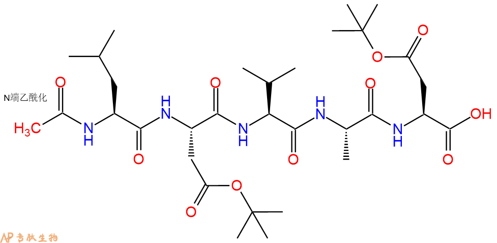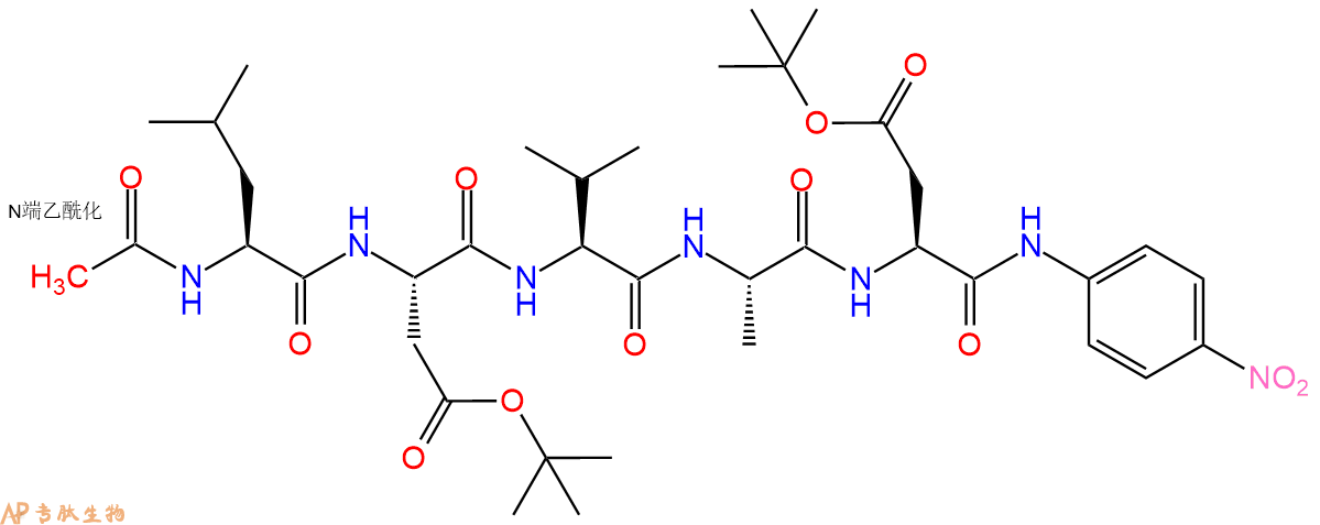 | 三字母: | Ac N端乙酰化封端,一种常见的修饰方式,常用于模拟蛋白质中的肽片段。 -LeuL-亮氨酸:leucine。系统命名为(2S)-氨基-4-甲基戊酸。是编码氨基酸。是哺乳动物的必需氨基酸。符号:L,Leu。 -AspL-天冬氨酸:aspartic acid。系统命名为(2S)-氨基-丁二酸。是编码氨基酸,又是神经递质。符号:D,Asp。D-天冬氨酸存在于多种细菌的细胞壁和短杆菌肽A中。 -ValL-缬氨酸:valine。系统命名为(2S)-氨基-3-甲基丁酸。是编码氨基酸。是哺乳动物的必需氨基酸。符号:V,Val。在某些放线菌素如缬霉素中存在 D-缬氨酸。 -Ala丙氨酸:alanine。L-丙氨酸的系统命名为(2S)-氨基丙酸,是编码氨基酸,也叫L-α-丙氨酸。符号:A,Ala。D-丙氨酸存在于多种细菌细胞壁的糖肽中。β-丙氨酸是维生素泛酸和辅酶A的组分。 -AspL-天冬氨酸:aspartic acid。系统命名为(2S)-氨基-丁二酸。是编码氨基酸,又是神经递质。符号:D,Asp。D-天冬氨酸存在于多种细菌的细胞壁和短杆菌肽A中。 -pNA对硝基苯胺 |
