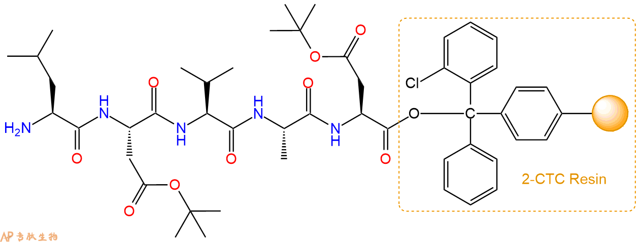 最后再经过步骤二得到 H2N-Leu-Asp(OtBu)-Val-Ala-Asp(OtBu)-CTC Resin,结构如下: