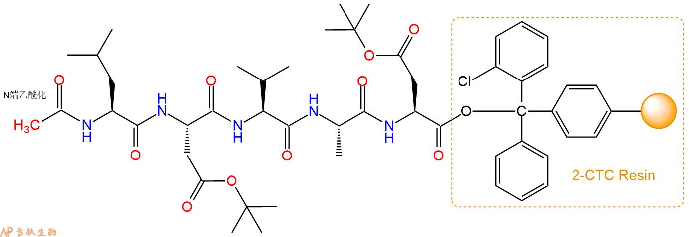 5、乙酸酐反应连接:在上述树脂中,加入适当DMF后,再加入2.7mmol 乙酸酐到树脂中,再加入5.4mmol DIPEA、2.57mmol HBTU,鼓氮气反应30分钟。用2倍树脂体积的DMF 洗涤3次树脂(洗涤树脂,去掉残留溶剂,为下一步反应做准备)。 得到Ac-Leu-Asp(OtBu)-Val-Ala-Asp(OtBu)-CTC Resin。 结构如下: