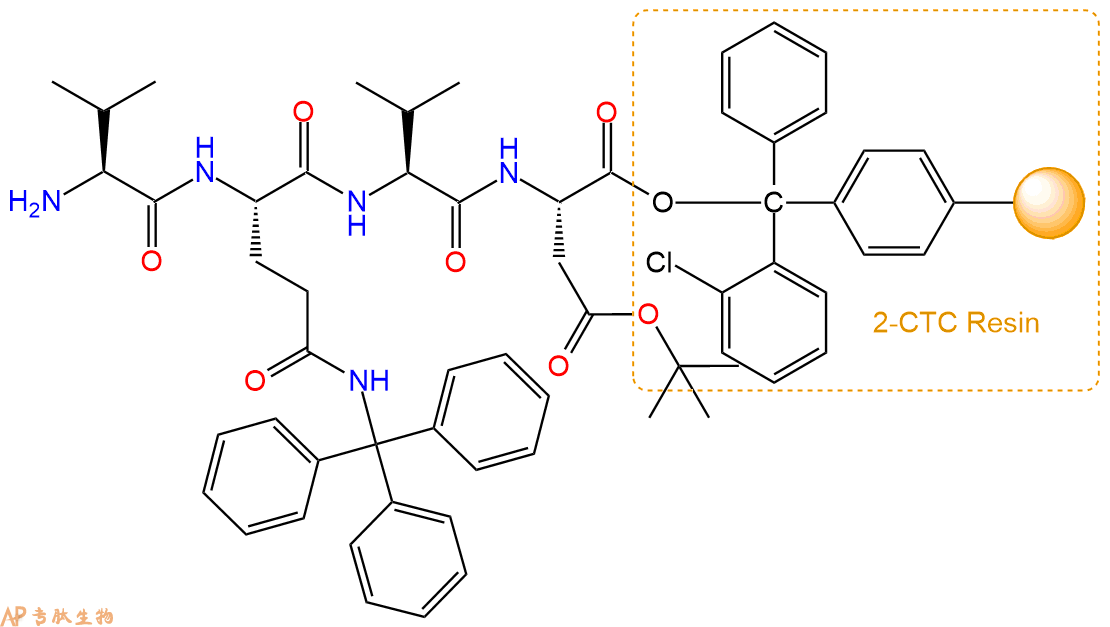 最后再经过步骤二得到 H2N-Val-Gln(Trt)-Val-Asp(OtBu)-CTC Resin,结构如下: