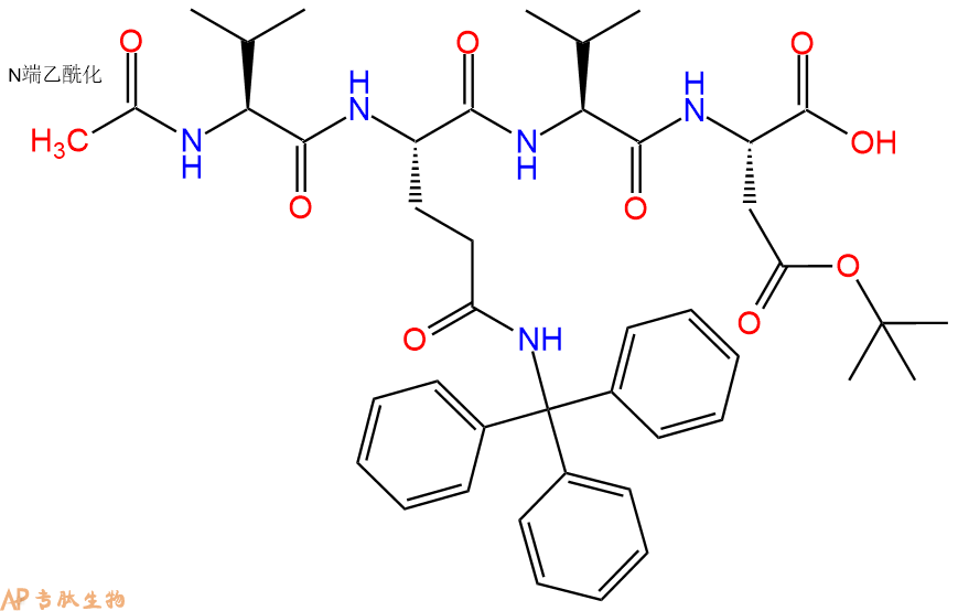 6、全保护切割:配置0.5%TFA/DCM溶液,溶液体积约为树脂体积的3倍。再次用DCM洗涤树脂2遍(去除残留DMF),后将配置好的溶液倒入到反应器中,反应30分钟。抽滤树脂,收集滤液(此时多肽已经从树脂上分离,存在于滤液中)。多肽序列为 Ac-Val-Gln(Trt)-Val-Asp(OtBu)-CTC Resin。 在滤液中添加DIEPA,调PH至7-8。用饱和NaHCO3洗涤滤液,分离出DCM层溶液。可适当旋蒸DCM层溶液,减少有机溶剂。再次加入1或2倍体积的乙酸乙酯,用稀HCl溶液调PH至微酸性,将多肽从DCM层萃取到乙酸乙酯层。用饱和NaCl洗涤2次乙酸乙酯层。用无水硫酸镁吸收乙酸乙酯层的水分。通过减压旋蒸,直接将乙酸乙酯完全旋蒸掉,得到晶体状固体多肽,用于下一步C端反应。或通过减压旋蒸保留适量乙酸乙酯的溶液体积,加入冰乙醚析出 多肽,然后对多肽进行烘干操作即可用于下一步C端反应。Ac-Val-Gln(Trt)-Val-Asp(OtBu)-COOH的结构图如下。