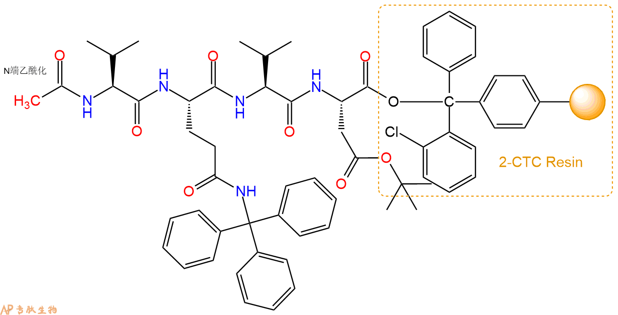5、乙酸酐反应连接:在上述树脂中,加入适当DMF后,再加入1.68mmol 乙酸酐到树脂中,再加入3.36mmol DIPEA、1.6mmol HBTU,鼓氮气反应30分钟。用2倍树脂体积的DMF 洗涤3次树脂(洗涤树脂,去掉残留溶剂,为下一步反应做准备)。 得到Ac-Val-Gln(Trt)-Val-Asp(OtBu)-CTC Resin。 结构如下: