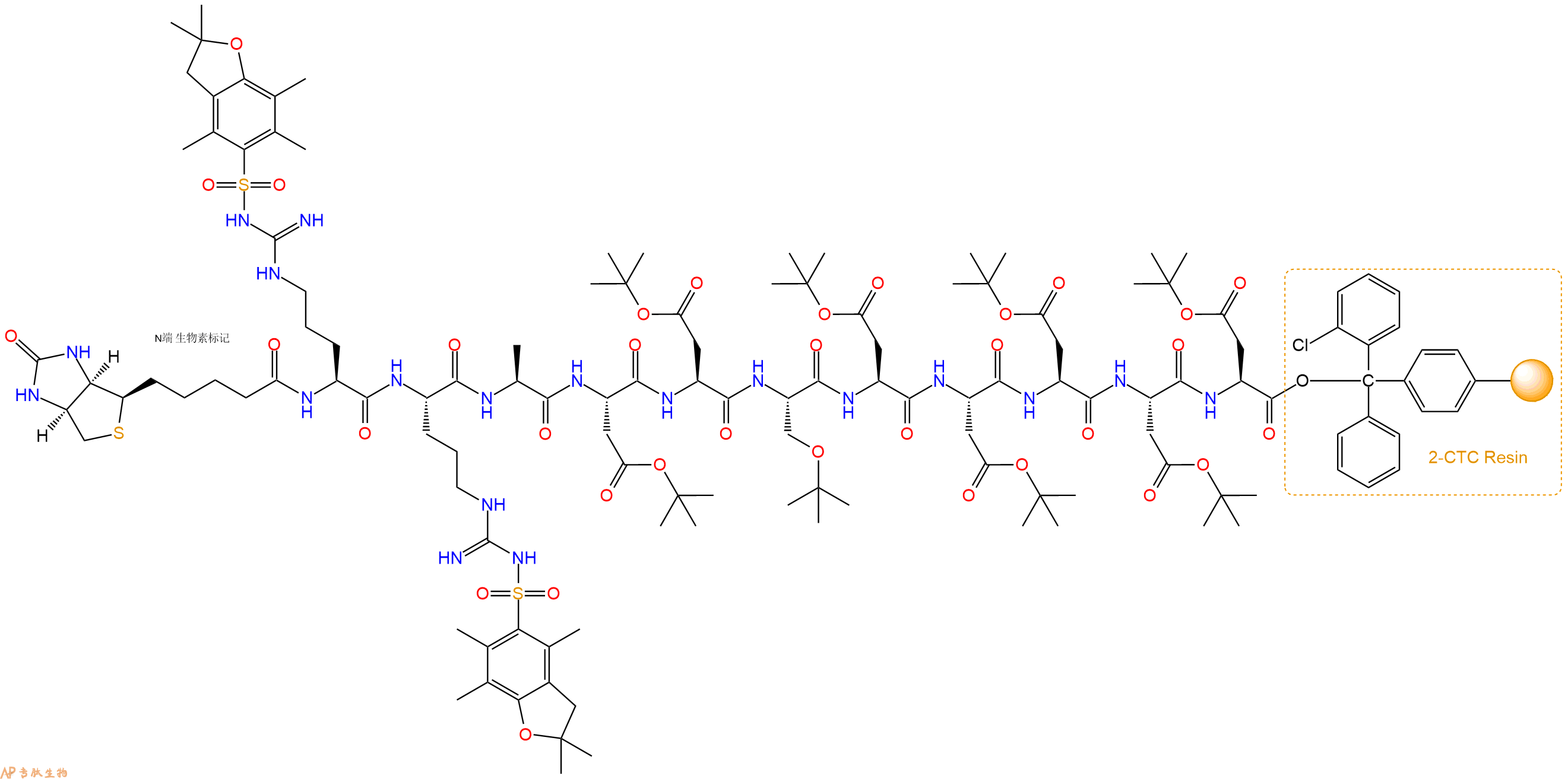 5、生物素反应连接:在上述树脂中,加入适当DMF后,再加入3.52mmol 生物素到树脂中,再加入7.05mmol DIPEA、3.35mmol HBTU,鼓氮气反应30分钟。用2倍树脂体积的DMF 洗涤3次树脂(洗涤树脂,去掉残留溶剂,为下一步反应做准备)。 得到Biotin-Arg(Pbf)-Arg(Pbf)-Ala-Asp(OtBu)-Asp(OtBu)-Ser(tBu)-Asp(OtBu)-Asp(OtBu)-Asp(OtBu)-Asp(OtBu)-Asp(OtBu)-CTCResin。 结构如下: