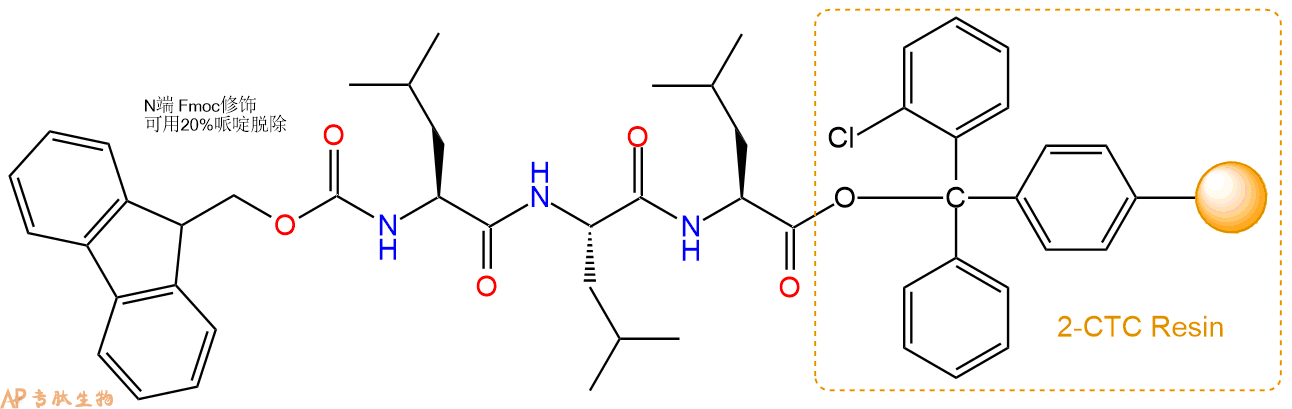 最后再经过步骤二得到 H2N-Leu-Leu-Leu-CTC Resin,结构如下: