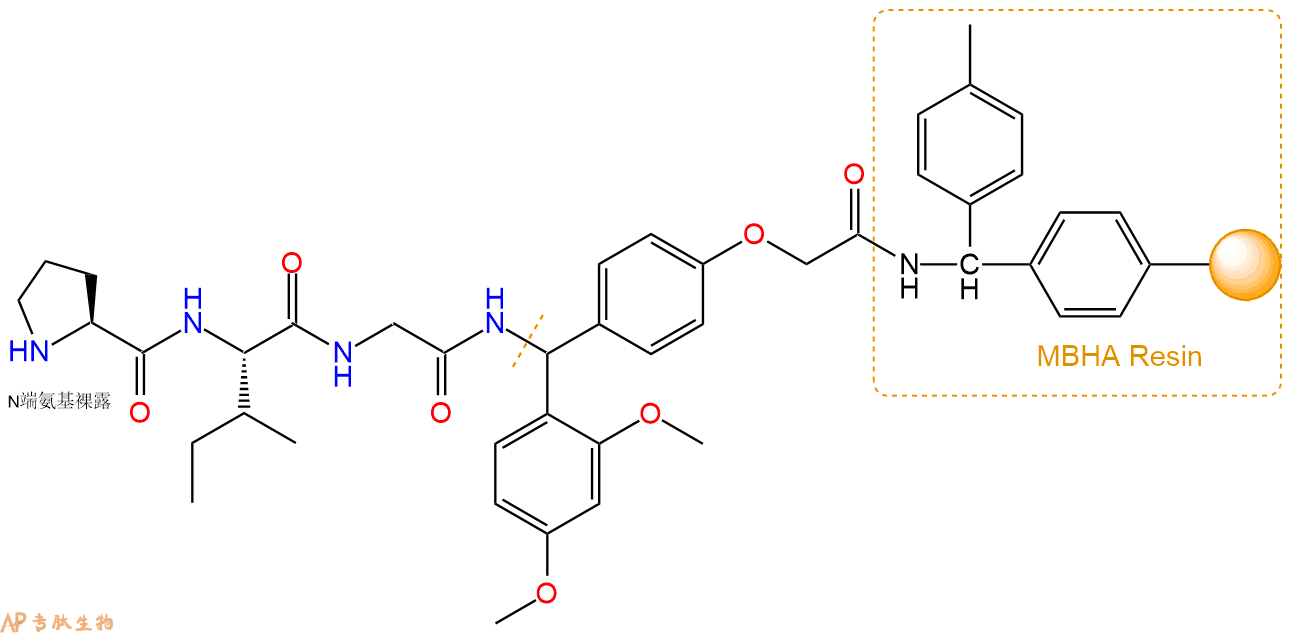 最后再经过步骤二得到 H2N-Pro-Ile-Gly-Linker-MBHA Resin,结构如下: