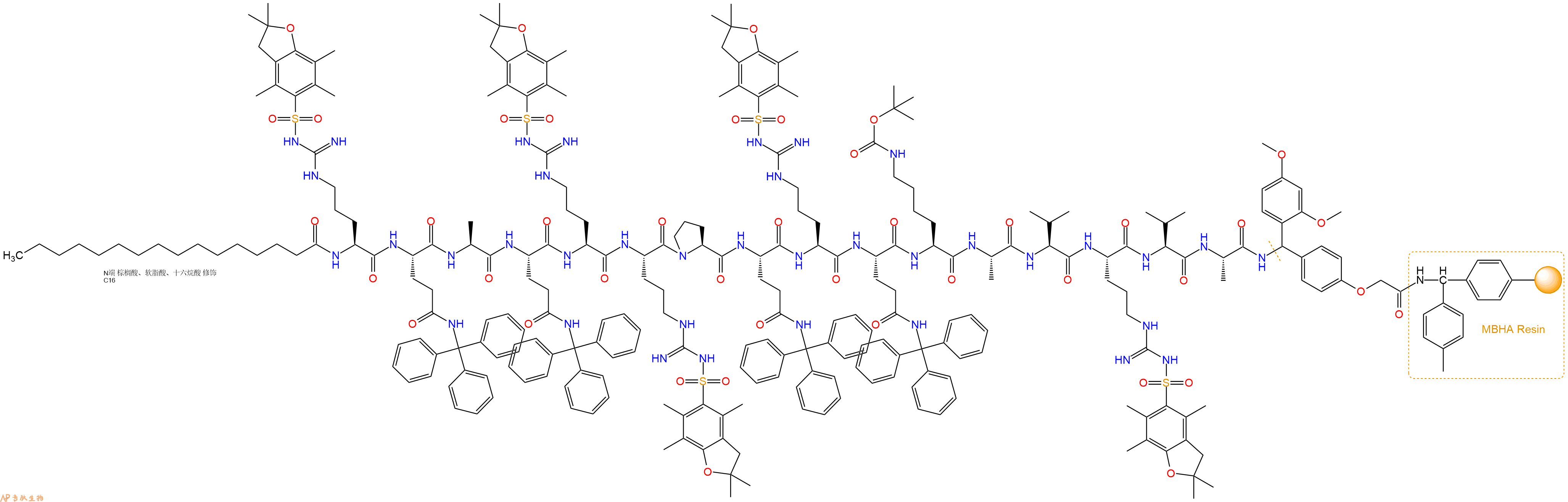 5、棕榈酸反应连接:在上述树脂中,加入适当DMF后,再加入2.66mmol 棕榈酸到树脂中,再加入5.31mmol DIPEA、2.52mmol HBTU,鼓氮气反应30分钟。用2倍树脂体积的DMF 洗涤3次树脂(洗涤树脂,去掉残留溶剂,为下一步反应做准备)。 得到Palmiticacid-Arg(Pbf)-Gln(Trt)-Ala-Gln(Trt)-Arg(Pbf)-Arg(Pbf)-Pro-Gln(Trt)-Arg(Pbf)-Gln(Trt)-Lys(Boc)-Ala-Val-Arg(Pbf)-Val-Ala-Linker-MBHAResin。 结构如下: