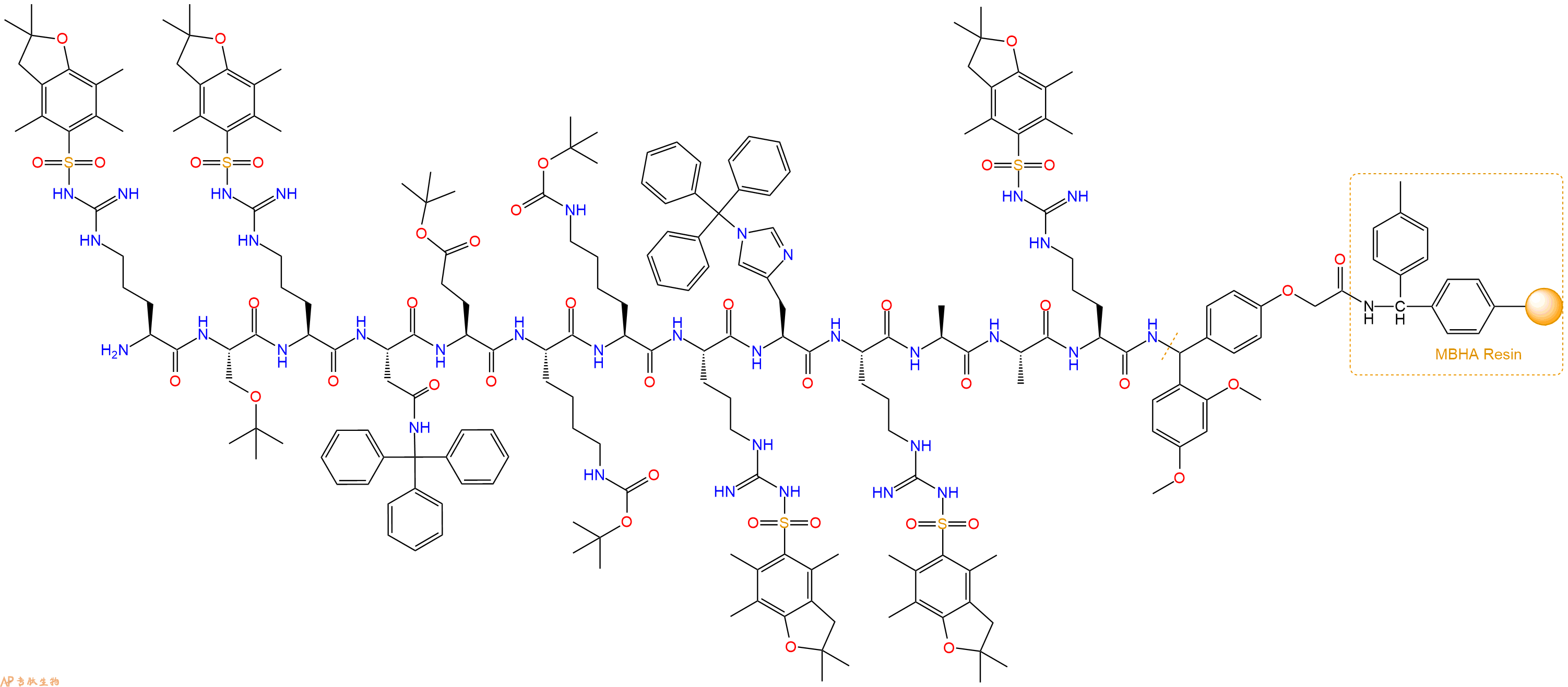 Fmoc-Arg(Pbf)-Ser(tBu)-Arg(Pbf)-Asn(Trt)-Glu(OtBu)-Lys(Boc)-Lys(Boc)-Arg(Pbf)-His(Trt)-Arg(Pbf)-Ala-Ala-Arg(Pbf)-Linker-MBHA Resin