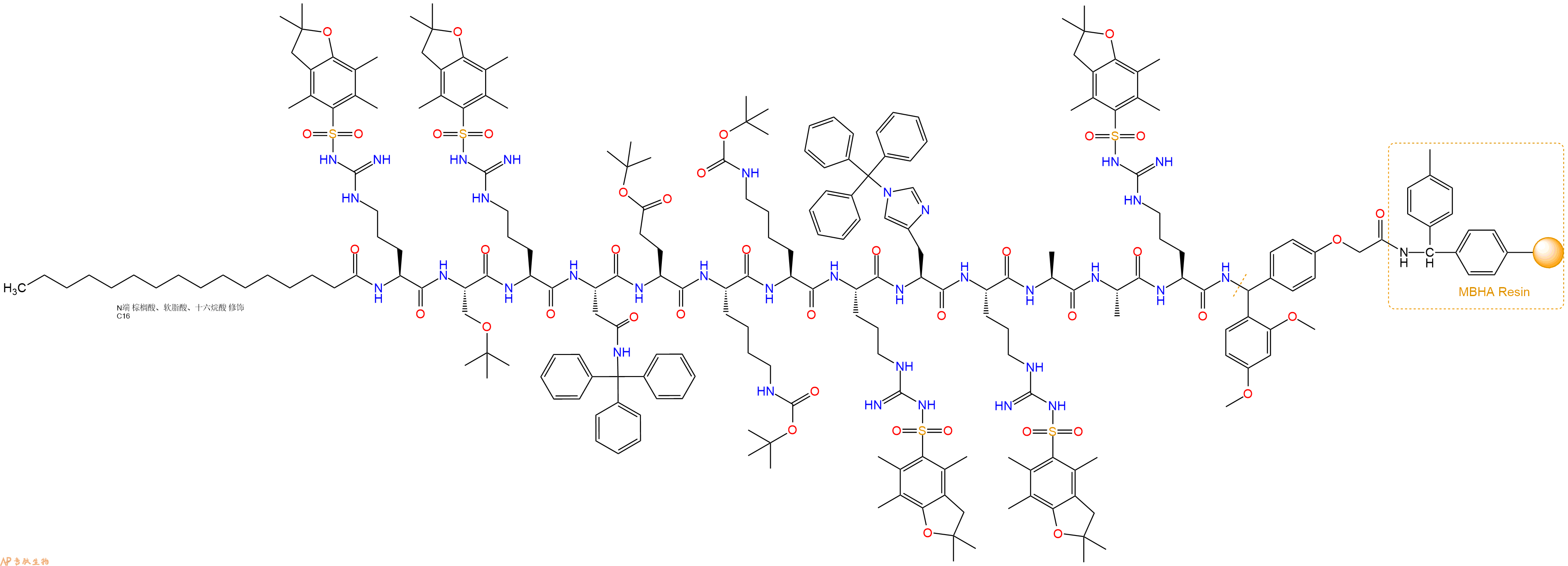 5、棕榈酸反应连接:在上述树脂中,加入适当DMF后,再加入1.72mmol 棕榈酸到树脂中,再加入3.44mmol DIPEA、1.63mmol HBTU,鼓氮气反应30分钟。用2倍树脂体积的DMF 洗涤3次树脂(洗涤树脂,去掉残留溶剂,为下一步反应做准备)。 得到Palmiticacid-Arg(Pbf)-Ser(tBu)-Arg(Pbf)-Asn(Trt)-Glu(OtBu)-Lys(Boc)-Lys(Boc)-Arg(Pbf)-His(Trt)-Arg(Pbf)-Ala-Ala-Arg(Pbf)-Linker-MBHAResin。 结构如下: