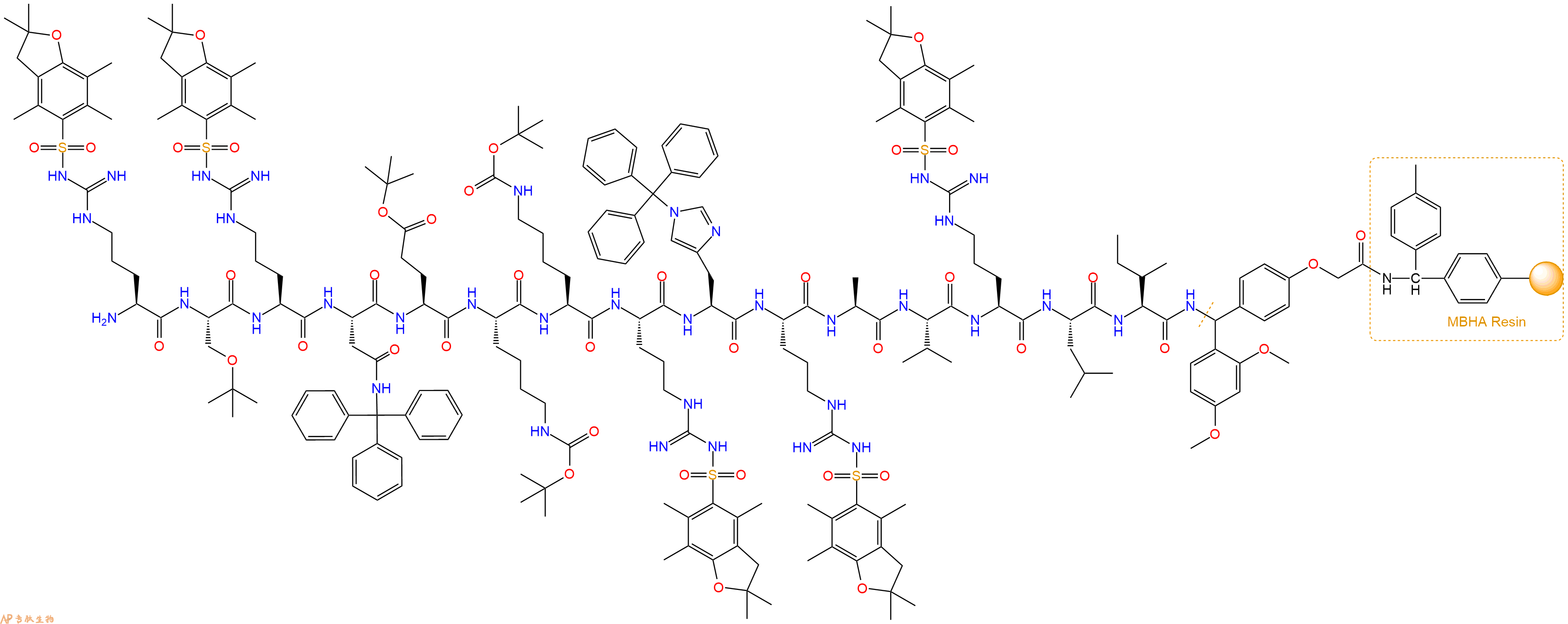 Fmoc-Arg(Pbf)-Asn(Trt)-Glu(OtBu)-Lys(Boc)-Lys(Boc)-Arg(Pbf)-His(Trt)-Arg(Pbf)-Ala-Val-Arg(Pbf)-Leu-Ile-Linker-MBHA Resin