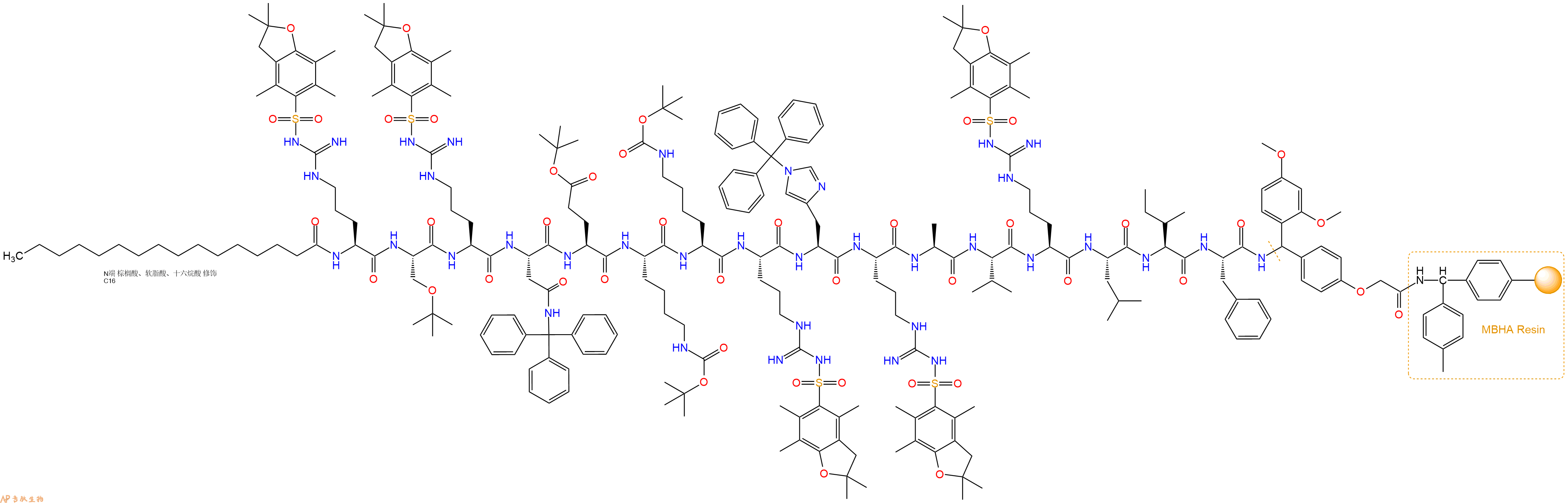 5、棕榈酸反应连接:在上述树脂中,加入适当DMF后,再加入1.12mmol 棕榈酸到树脂中,再加入2.25mmol DIPEA、1.07mmol HBTU,鼓氮气反应30分钟。用2倍树脂体积的DMF 洗涤3次树脂(洗涤树脂,去掉残留溶剂,为下一步反应做准备)。 得到Palmiticacid-Arg(Pbf)-Ser(tBu)-Arg(Pbf)-Asn(Trt)-Glu(OtBu)-Lys(Boc)-Lys(Boc)-Arg(Pbf)-His(Trt)-Arg(Pbf)-Ala-Val-Arg(Pbf)-Leu-Ile-Phe-Linker-MBHAResin。 结构如下: