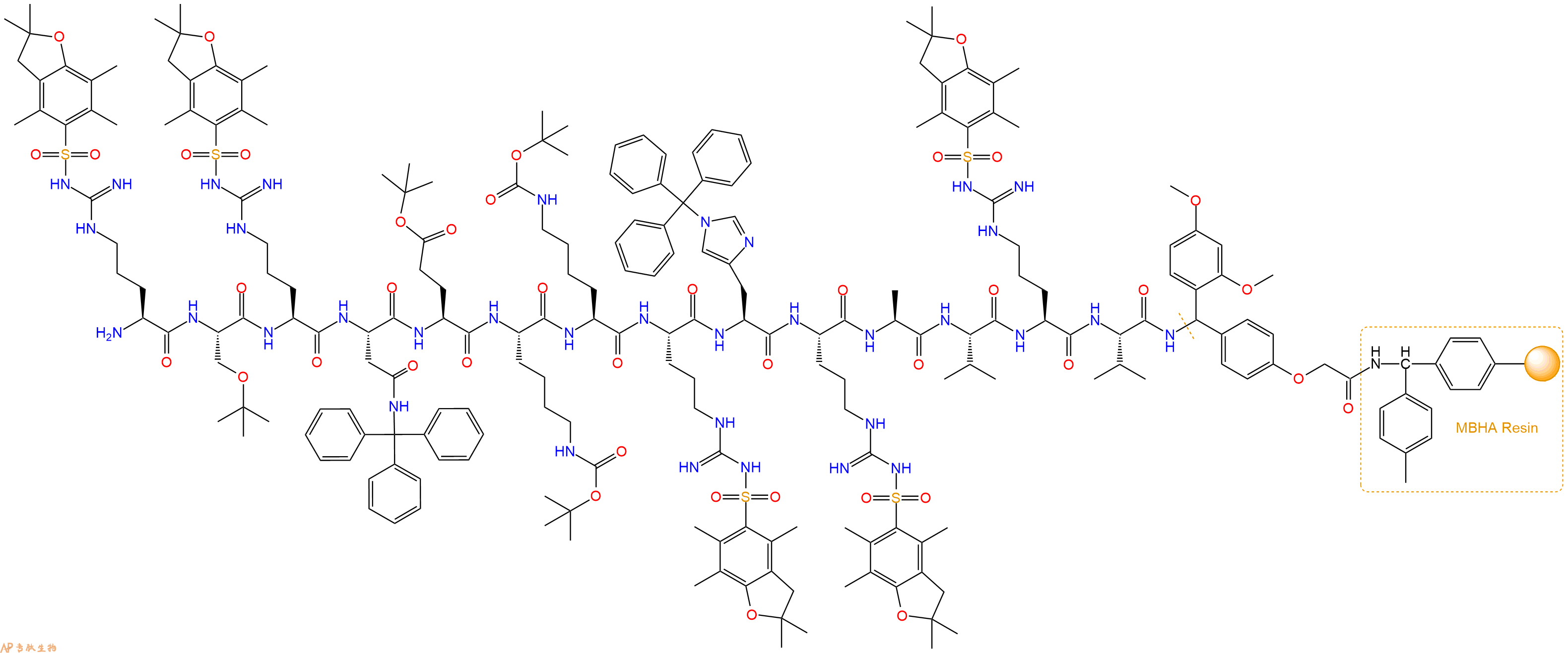 Fmoc-Arg(Pbf)-Asn(Trt)-Glu(OtBu)-Lys(Boc)-Lys(Boc)-Arg(Pbf)-His(Trt)-Arg(Pbf)-Ala-Val-Arg(Pbf)-Val-Linker-MBHA Resin