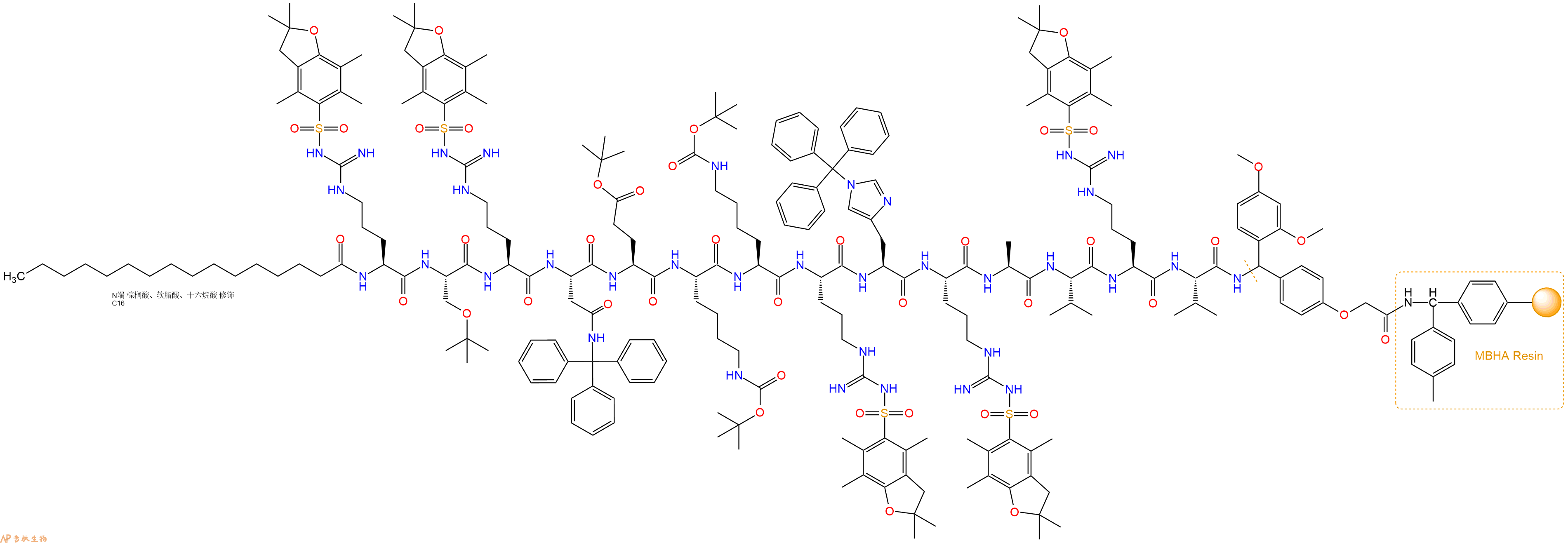 5、棕榈酸反应连接:在上述树脂中,加入适当DMF后,再加入2.49mmol 棕榈酸到树脂中,再加入4.99mmol DIPEA、2.37mmol HBTU,鼓氮气反应30分钟。用2倍树脂体积的DMF 洗涤3次树脂(洗涤树脂,去掉残留溶剂,为下一步反应做准备)。 得到Palmiticacid-Arg(Pbf)-Ser(tBu)-Arg(Pbf)-Asn(Trt)-Glu(OtBu)-Lys(Boc)-Lys(Boc)-Arg(Pbf)-His(Trt)-Arg(Pbf)-Ala-Val-Arg(Pbf)-Val-Linker-MBHAResin。 结构如下: