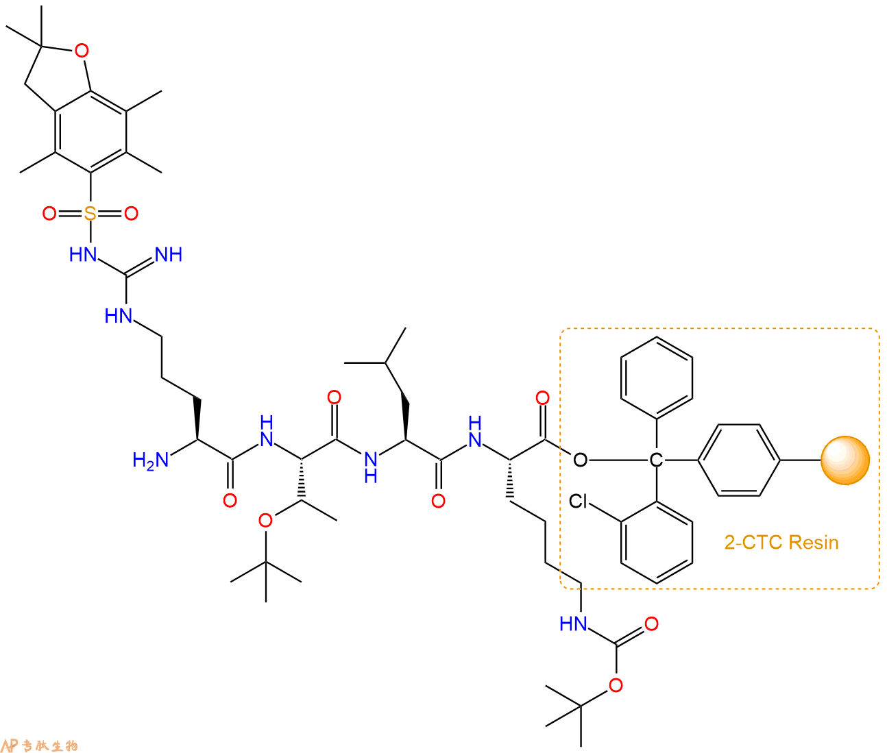 最后再经过步骤二得到 H2N-Arg(Pbf)-Thr(tBu)-Leu-Lys(Boc)-CTC Resin,结构如下: