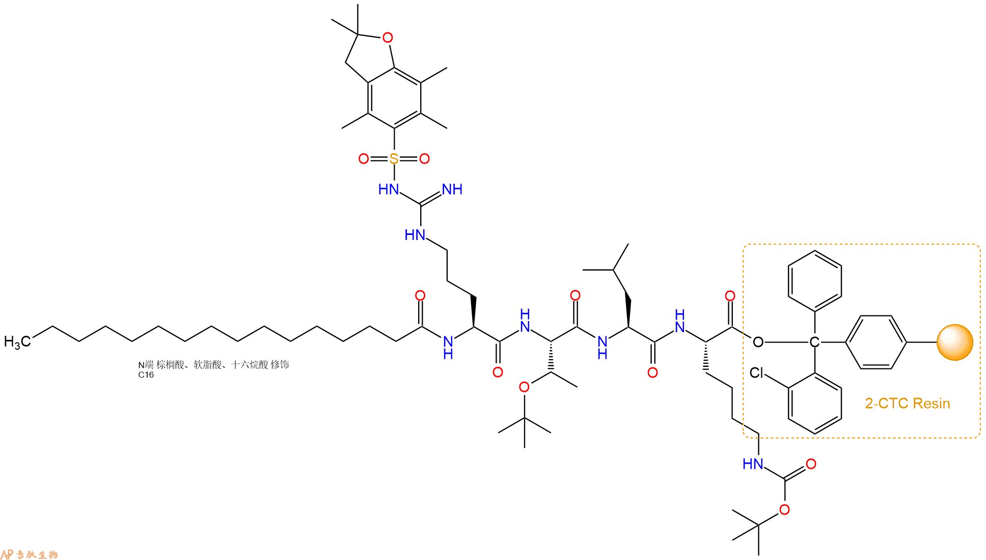 5、棕榈酸反应连接:在上述树脂中,加入适当DMF后,再加入6.43mmol棕榈酸到树脂中,再加入12.85mmol DIPEA,鼓氮气反应30分钟。用2倍树脂体积的DMF 洗涤3次树脂(洗涤树脂,去掉残留溶剂,为下一步反应做准备)。 得到Palmiticacid-Arg(Pbf)-Thr(tBu)-Leu-Lys(Boc)-CTC Resin。 结构如下: