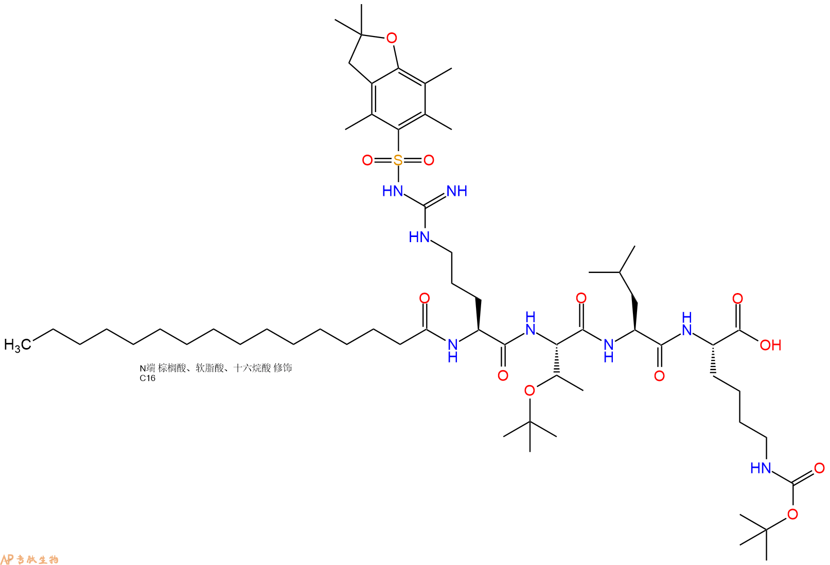 6、全保护切割:配置0.5%TFA/DCM溶液,溶液体积约为树脂体积的3倍。再次用DCM洗涤树脂2遍(去除残留DMF),后将配置好的溶液倒入到反应器中,反应30分钟。抽滤树脂,收集滤液(此时多肽已经从树脂上分离,存在于滤液中)。多肽序列为 Palmiticacid-Arg(Pbf)-Thr(tBu)-Leu-Lys(Boc)-CTC Resin。 在滤液中添加DIEPA,调PH至7-8。用饱和NaHCO3洗涤滤液,分离出DCM层溶液。可适当旋蒸DCM层溶液,减少有机溶剂。再次加入1或2倍体积的乙酸乙酯,用稀HCl溶液调PH至微酸性,将多肽从DCM层萃取到乙酸乙酯层。用饱和NaCl洗涤2次乙酸乙酯层。用无水硫酸镁吸收乙酸乙酯层的水分。通过减压旋蒸,直接将乙酸乙酯完全旋蒸掉,得到晶体状固体多肽,用于下一步C端反应。或通过减压旋蒸保留适量乙酸乙酯的溶液体积,加入冰乙醚析出 多肽,然后对多肽进行烘干操作即可用于下一步C端反应。Palmiticacid-Arg(Pbf)-Thr(tBu)-Leu-Lys(Boc)-COOH的结构图如下。