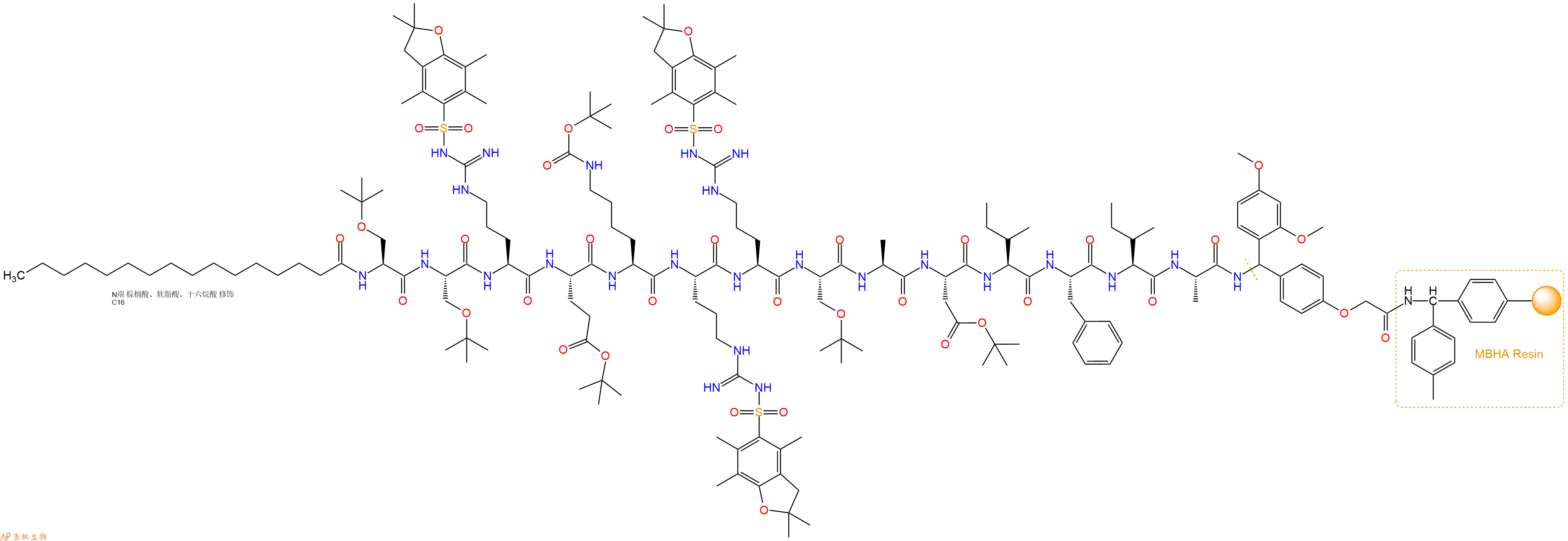 5、棕榈酸反应连接:在上述树脂中,加入适当DMF后,再加入2.02mmol 棕榈酸到树脂中,再加入4.05mmol DIPEA、1.92mmol HBTU,鼓氮气反应30分钟。用2倍树脂体积的DMF 洗涤3次树脂(洗涤树脂,去掉残留溶剂,为下一步反应做准备)。 得到Palmiticacid-Ser(tBu)-Ser(tBu)-Arg(Pbf)-Glu(OtBu)-Lys(Boc)-Arg(Pbf)-Arg(Pbf)-Ser(tBu)-Ala-Asp(OtBu)-Ile-Phe-Ile-Ala-Linker-MBHAResin。 结构如下: