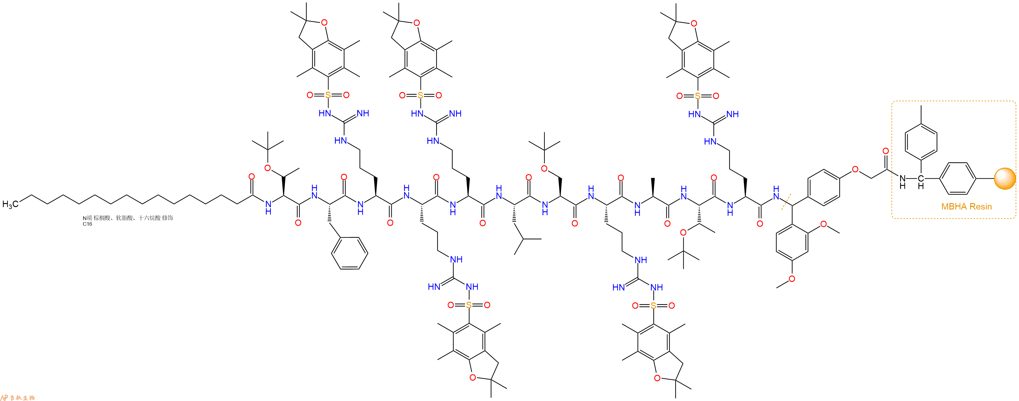 5、棕榈酸反应连接:在上述树脂中,加入适当DMF后,再加入2.46mmol 棕榈酸到树脂中,再加入4.91mmol DIPEA、2.33mmol HBTU,鼓氮气反应30分钟。用2倍树脂体积的DMF 洗涤3次树脂(洗涤树脂,去掉残留溶剂,为下一步反应做准备)。 得到Palmiticacid-Thr(tBu)-Phe-Arg(Pbf)-Arg(Pbf)-Arg(Pbf)-Leu-Ser(tBu)-Arg(Pbf)-Ala-Thr(tBu)-Arg(Pbf)-Linker-MBHAResin。 结构如下: