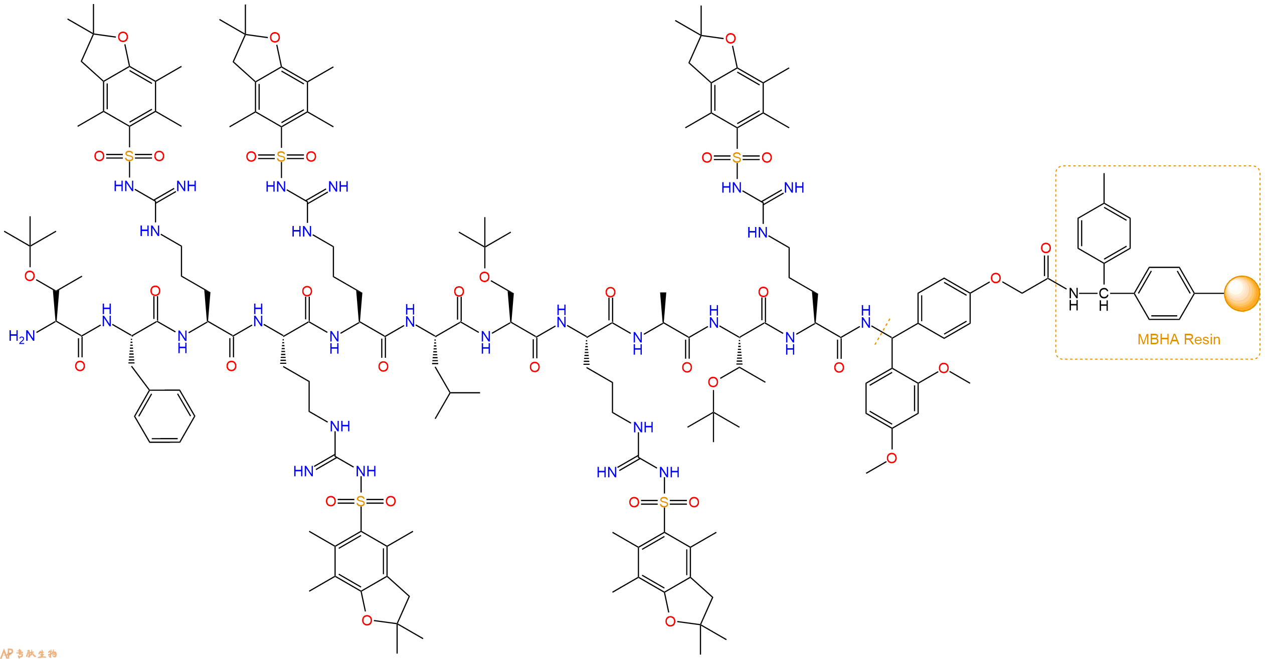 Fmoc-Thr(tBu)-Phe-Arg(Pbf)-Arg(Pbf)-Arg(Pbf)-Leu-Ser(tBu)-Arg(Pbf)-Ala-Thr(tBu)-Arg(Pbf)-Linker-MBHA Resin