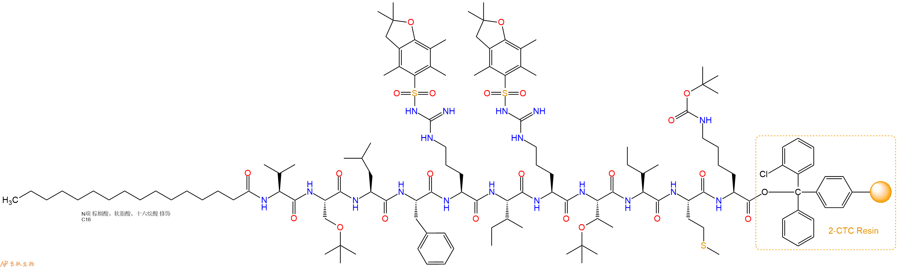 5、棕榈酸反应连接:在上述树脂中,加入适当DMF后,再加入1.36mmol 棕榈酸到树脂中,再加入2.72mmol DIPEA、1.29mmol HBTU,鼓氮气反应30分钟。用2倍树脂体积的DMF 洗涤3次树脂(洗涤树脂,去掉残留溶剂,为下一步反应做准备)。 得到Palmiticacid-Val-Ser(tBu)-Leu-Phe-Arg(Pbf)-Ile-Arg(Pbf)-Thr(tBu)-Ile-Met-Lys(Boc)-CTCResin。 结构如下: