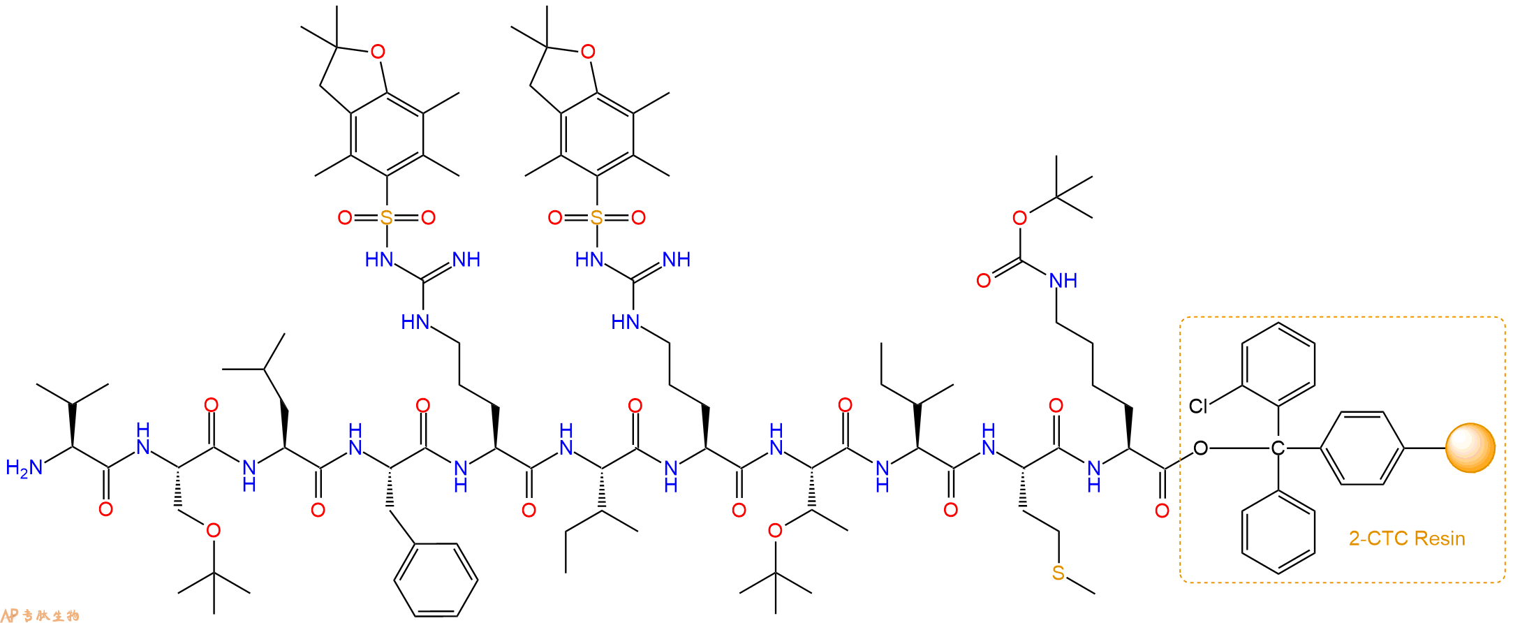 最后再经过步骤二得到 H2N-Val-Ser(tBu)-Leu-Phe-Arg(Pbf)-Ile-Arg(Pbf)-Thr(tBu)-Ile-Met-Lys(Boc)-CTC Resin,结构如下: