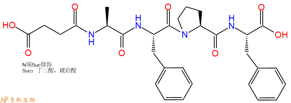 | 三字母: | Suc N端琥珀酰化,琥珀酰基是一种极性的N端修饰,对应于脱氨基天冬氨酸(deamino-Asp),常被掺入羧肽酶底物中。 -Ala丙氨酸:alanine。L-丙氨酸的系统命名为(2S)-氨基丙酸,是编码氨基酸,也叫L-α-丙氨酸。符号:A,Ala。D-丙氨酸存在于多种细菌细胞壁的糖肽中。β-丙氨酸是维生素泛酸和辅酶A的组分。 -PheL-苯丙氨酸:phenylalanine。系统命名为(2S)-氨基-3-苯基丙酸。是编码氨基酸。是哺乳动物的必需氨基酸。符号:F,Phe。 -ProL-脯氨酸:proline。系统命名为吡咯烷-(2S)-羧酸。为亚氨基酸。是编码氨基酸。在肽链中有特殊作用,如易形成顺式的肽键等。符号:P,Pro。 -PheL-苯丙氨酸:phenylalanine。系统命名为(2S)-氨基-3-苯基丙酸。是编码氨基酸。是哺乳动物的必需氨基酸。符号:F,Phe。 -AMC7-氨基-4-甲基香豆素(AMC或Amc)是一种荧光染料,其激发波长为350纳米,发射波长为450纳米。 |