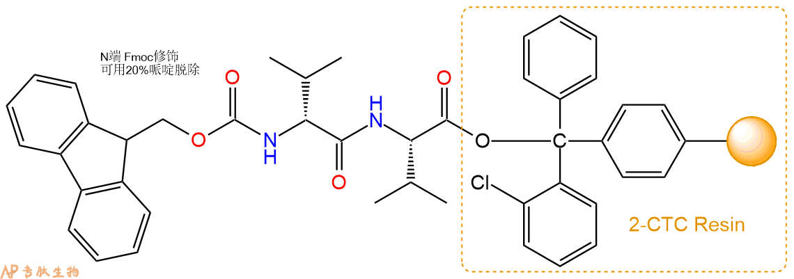 1、合成CTC树脂:称取1.05g CTC Resin(如初始取代度约为0.55mmol/g)和0.69mmol Fmoc-Val-OH于反应器中,加入适量DCM溶解氨基酸(需要注意,此时CTC树脂体积会增大好几倍,避免DCM溶液过少),再加入1.73mmol DIPEA(Mw:129.1,d:0.740g/ml),反应2-3小时后,可不抽滤溶液,直接加入1ml的HPLC级甲醇,封端半小时。依次用DMF洗涤2次,甲醇洗涤1次,DCM洗涤一次,甲醇洗涤一次,DCM洗涤一次,DMF洗涤2次(这里使用甲醇和DCM交替洗涤,是为了更好地去除其他溶质,有利于后续反应)。得到 Fmoc-Val-CTC Resin。结构图如下: