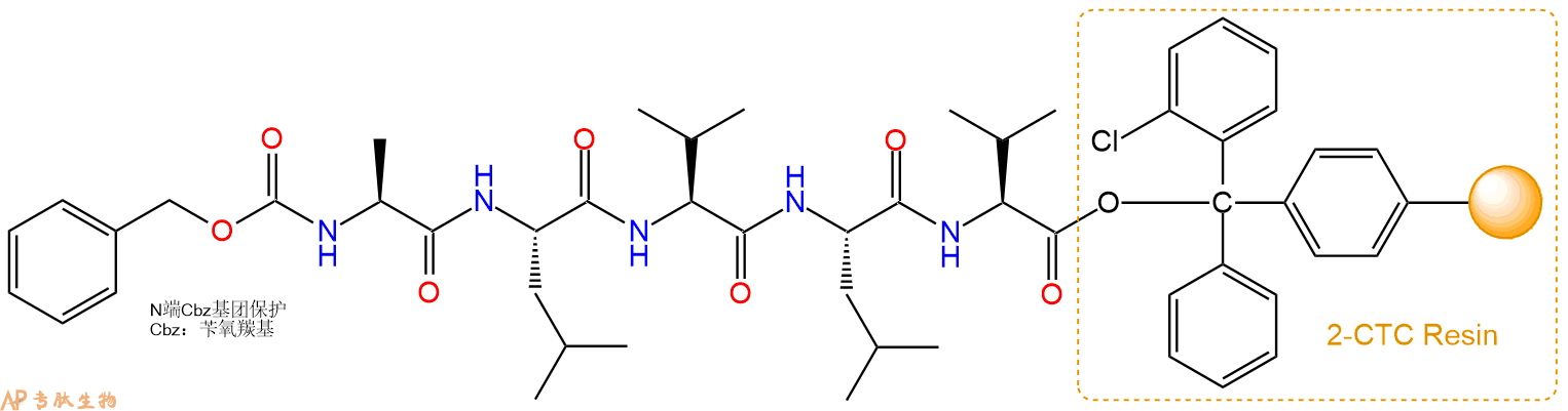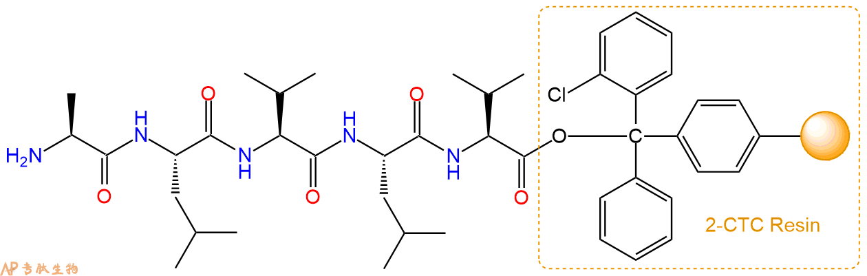最后再经过步骤二得到 H2N-Ala-Leu-Val-Leu-Val-CTC Resin,结构如下: