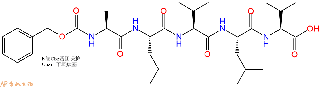 6、全保护切割:配置0.5%TFA/DCM溶液,溶液体积约为树脂体积的3倍。再次用DCM洗涤树脂2遍(去除残留DMF),后将配置好的溶液倒入到反应器中,反应30分钟。抽滤树脂,收集滤液(此时多肽已经从树脂上分离,存在于滤液中)。多肽序列为 Cbz-Ala-Leu-Val-Leu-Val-CTC Resin。 在滤液中添加DIEPA,调PH至7-8。用饱和NaHCO3洗涤滤液,分离出DCM层溶液。可适当旋蒸DCM层溶液,减少有机溶剂。再次加入1或2倍体积的乙酸乙酯,用稀HCl溶液调PH至微酸性,将多肽从DCM层萃取到乙酸乙酯层。用饱和NaCl洗涤2次乙酸乙酯层。用无水硫酸镁吸收乙酸乙酯层的水分。通过减压旋蒸,直接将乙酸乙酯完全旋蒸掉,得到晶体状固体多肽,用于下一步C端反应。或通过减压旋蒸保留适量乙酸乙酯的溶液体积,加入冰乙醚析出 多肽,然后对多肽进行烘干操作即可用于下一步C端反应。Cbz-Ala-Leu-Val-Leu-Val-COOH的结构图如下。