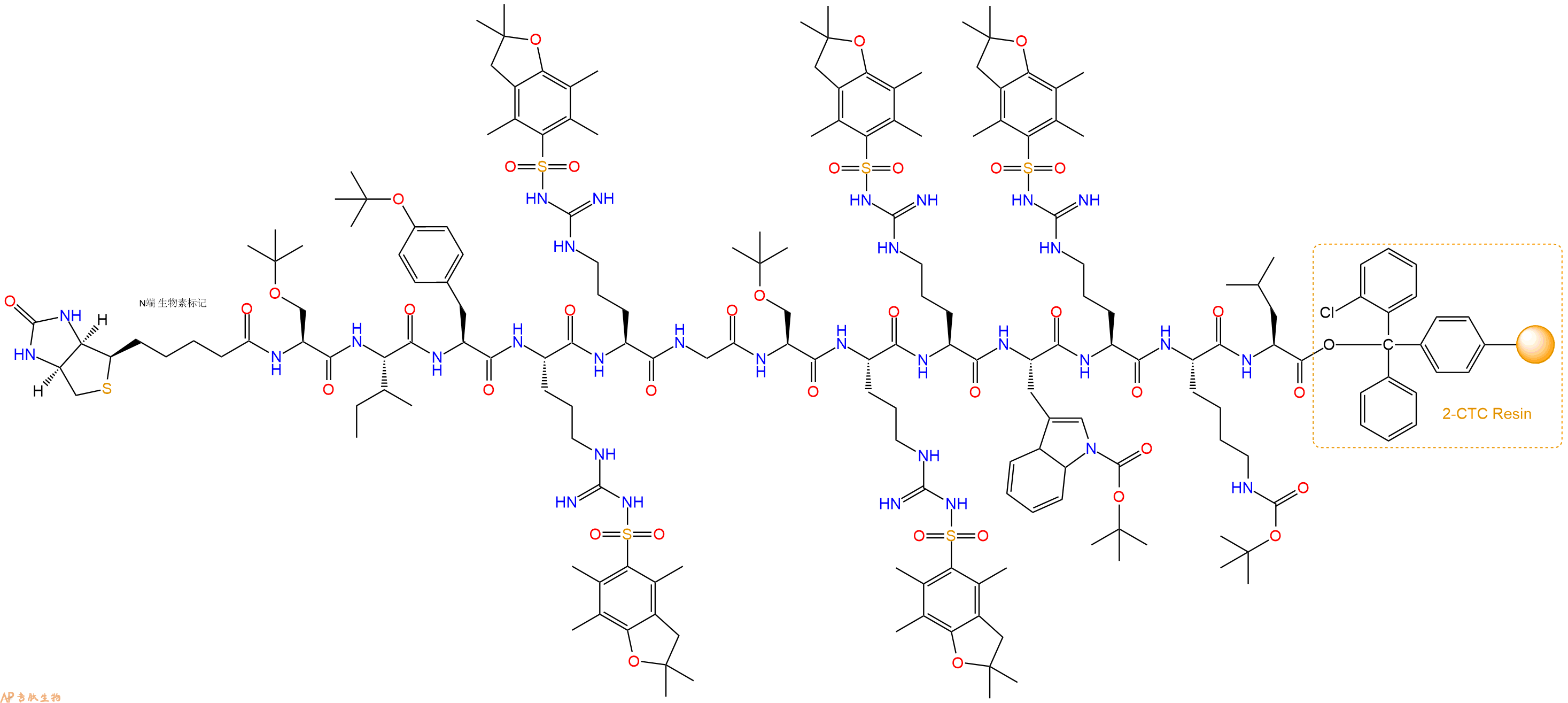 5、生物素反应连接:在上述树脂中,加入适当DMF后,再加入8.97mmol 生物素到树脂中,再加入17.94mmol DIPEA、8.52mmol HBTU,鼓氮气反应30分钟。用2倍树脂体积的DMF 洗涤3次树脂(洗涤树脂,去掉残留溶剂,为下一步反应做准备)。 得到Biotin-Ser(tBu)-Ile-Tyr(tBu)-Arg(Pbf)-Arg(Pbf)-Gly-Ser(tBu)-Arg(Pbf)-Arg(Pbf)-Trp(Boc)-Arg(Pbf)-Lys(Boc)-Leu-CTCResin。 结构如下: