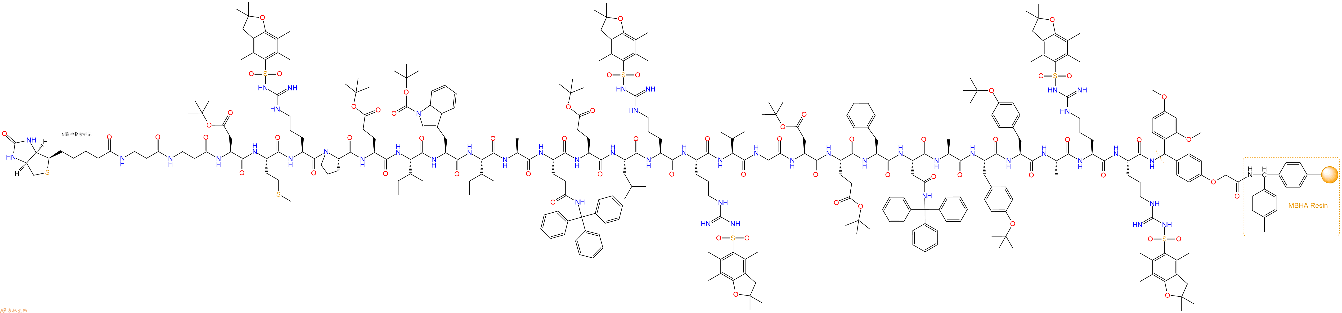 5、生物素反应连接:在上述树脂中,加入适当DMF后,再加入2.12mmol 生物素到树脂中,再加入4.25mmol DIPEA、2.02mmol HBTU,鼓氮气反应30分钟。用2倍树脂体积的DMF 洗涤3次树脂(洗涤树脂,去掉残留溶剂,为下一步反应做准备)。 得到Biotin-βAla-βAla-Asp(OtBu)-Met-Arg(Pbf)-Pro-Glu(OtBu)-Ile-Trp(Boc)-Ile-Ala-Gln(Trt)-Glu(OtBu)-Leu-Arg(Pbf)-Arg(Pbf)-Ile-Gly-Asp(OtBu)-Glu(OtBu)-Phe-Asn(Trt)-Ala-Tyr(tBu)-Tyr(tBu)-Ala-Arg(Pbf)-Arg(Pbf)-Linker-MBHAResin。 结构如下: