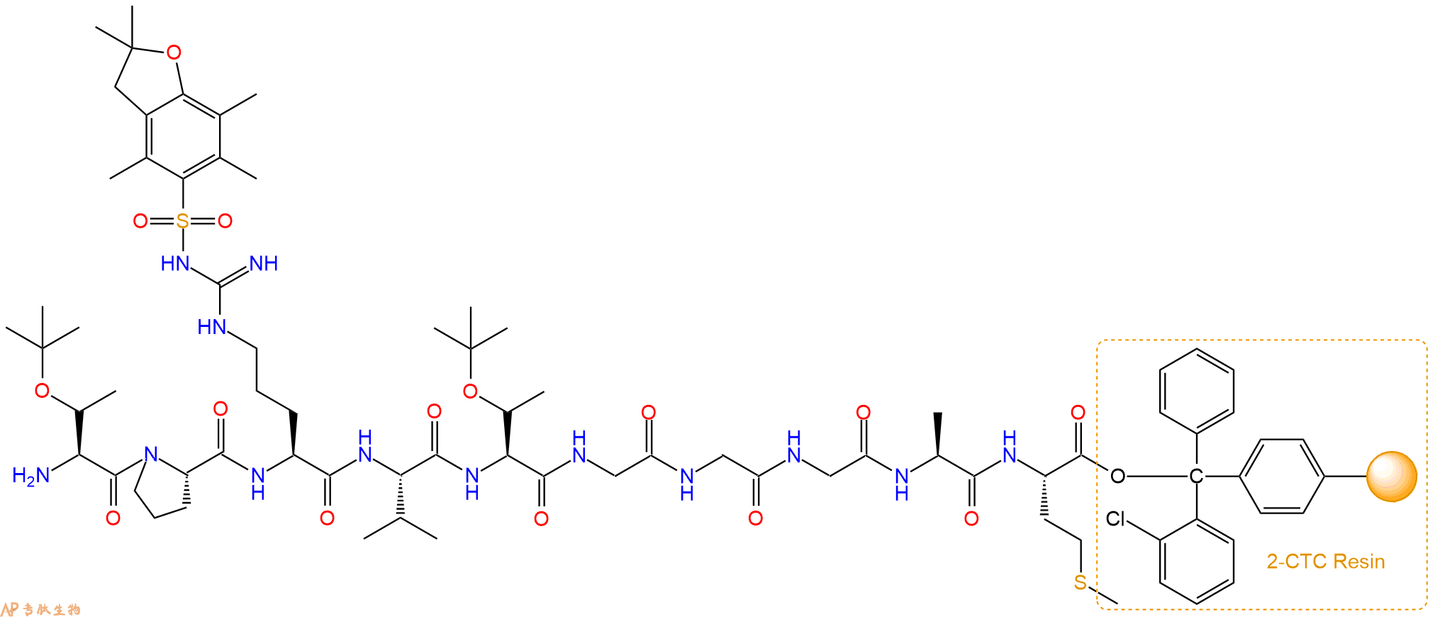 最后再经过步骤二得到 H2N-Thr(tBu)-Pro-Arg(Pbf)-Val-Thr(tBu)-Gly-Gly-Gly-Ala-Met-CTC Resin,结构如下: