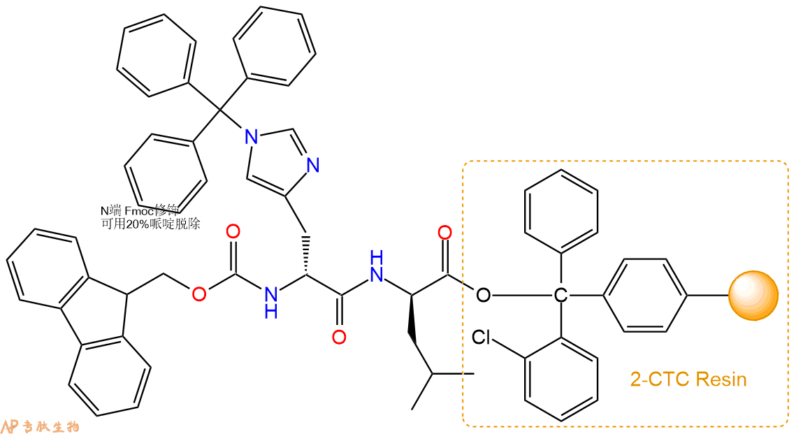 3、缩合:取2.65mmol Fmoc-DHis(Trt)-OH 氨基酸,加入到上述树脂里,加适当DMF溶解氨基酸,再依次加入5.3mmol DIPEA,2.52mmol HBTU。反应30分钟后,取小样洗涤,茚三酮检测为无色。用2倍树脂体积的DMF 洗涤3次树脂。(洗涤树脂,去掉残留溶剂,为下一步反应做准备)。得到Fmoc-DHis(Trt)-DLeu-CTC Resin。氨基酸:DIPEA:HBTU:树脂=3:6:2.85:1(摩尔比)。结构图如下: