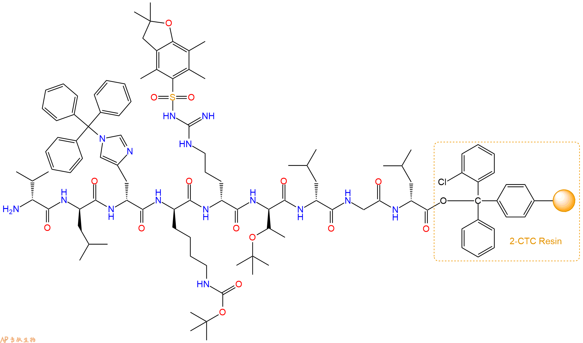 最后再经过步骤二得到 H2N-DVal-DLeu-DHis(Trt)-DLys(Boc)-DArg(Pbf)-DThr(tBu)-DLeu-Gly-DLeu-CTC Resin,结构如下: