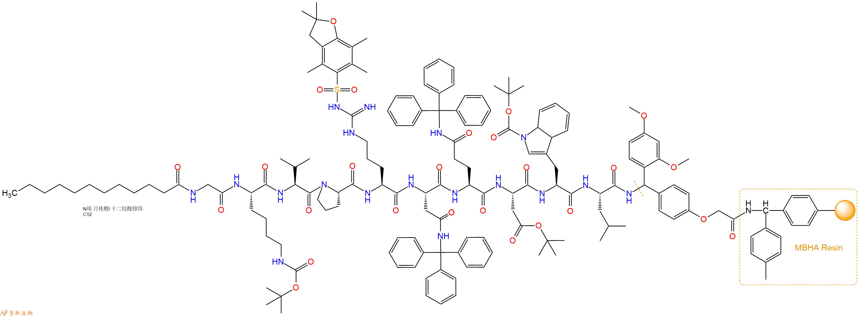 5、十二烷酸反应连接:在上述树脂中,加入适当DMF后,再加入1.99mmol 十二烷酸到树脂中,再加入3.98mmol DIPEA、1.89mmol HBTU,鼓氮气反应30分钟。用2倍树脂体积的DMF 洗涤3次树脂(洗涤树脂,去掉残留溶剂,为下一步反应做准备)。 得到Lauricacid-Gly-Lys(Boc)-Val-Pro-Arg(Pbf)-Asn(Trt)-Gln(Trt)-Asp(OtBu)-Trp(Boc)-Leu-Linker-MBHAResin。 结构如下: