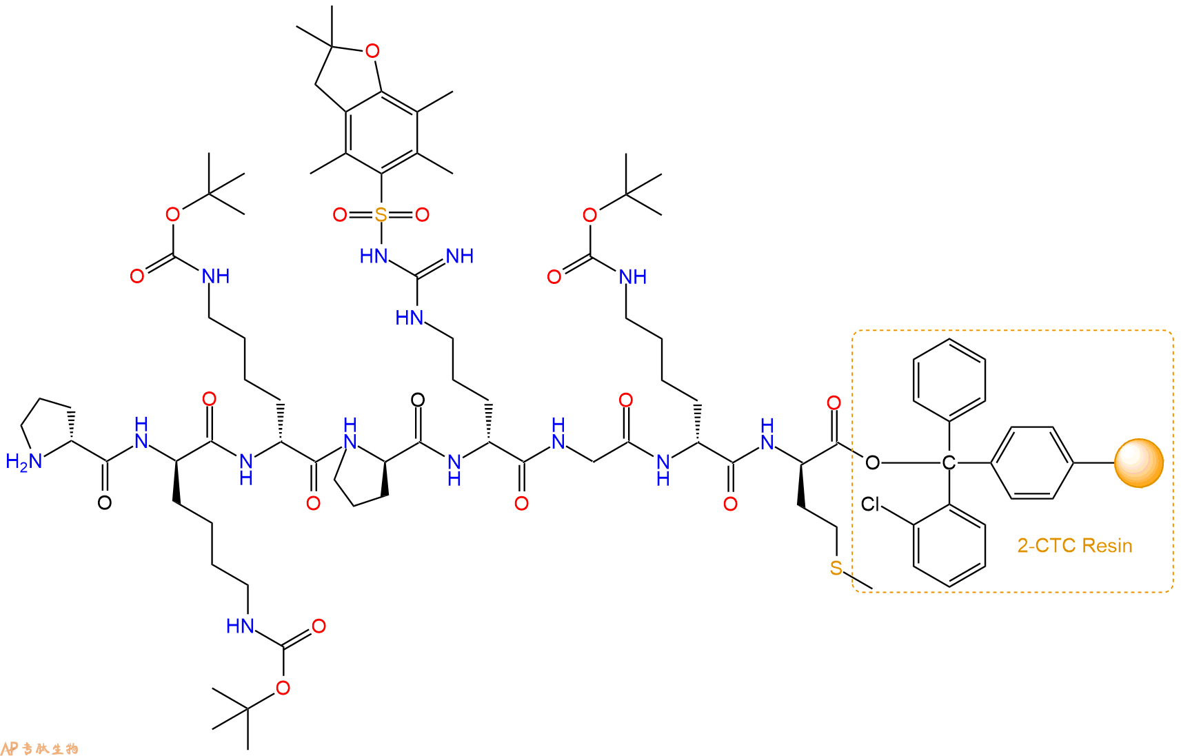 最后再经过步骤二得到 H2N-DPro-DLys(Boc)-DLys(Boc)-DPro-DArg(Pbf)-Gly-DLys(Boc)-DMet-CTC Resin,结构如下: