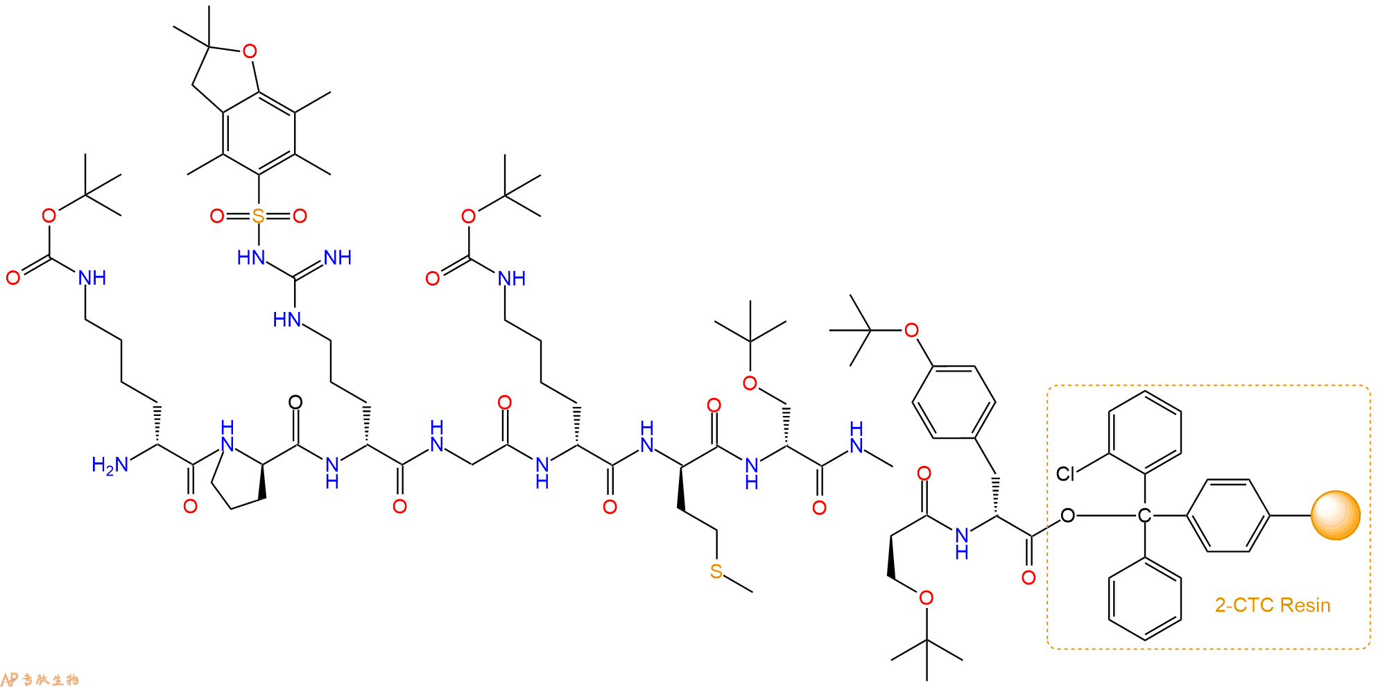最后再经过步骤二得到 H2N-DLys(Boc)-DPro-DArg(Pbf)-Gly-DLys(Boc)-DMet-DSer(tBu)-DSer(tBu)-DTyr(tBu)-CTC Resin,结构如下: