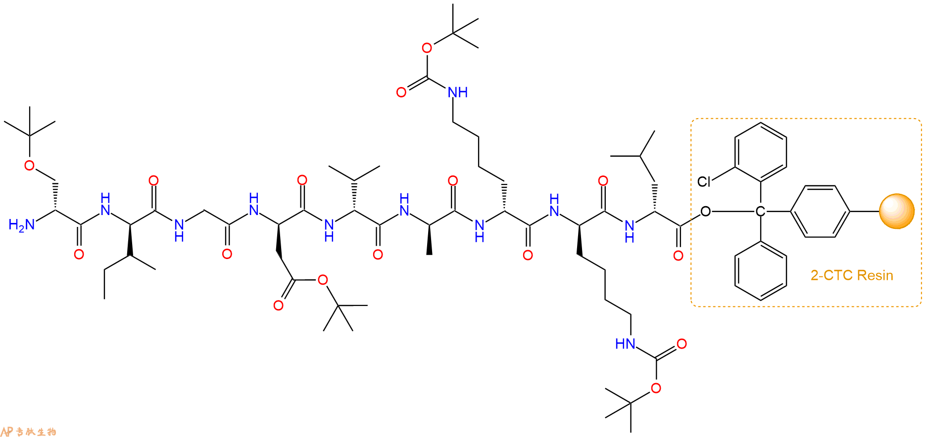 最后再经过步骤二得到 H2N-DSer(tBu)-DIle-Gly-DAsp(OtBu)-DVal-DAla-DLys(Boc)-DLys(Boc)-DLeu-CTC Resin,结构如下: