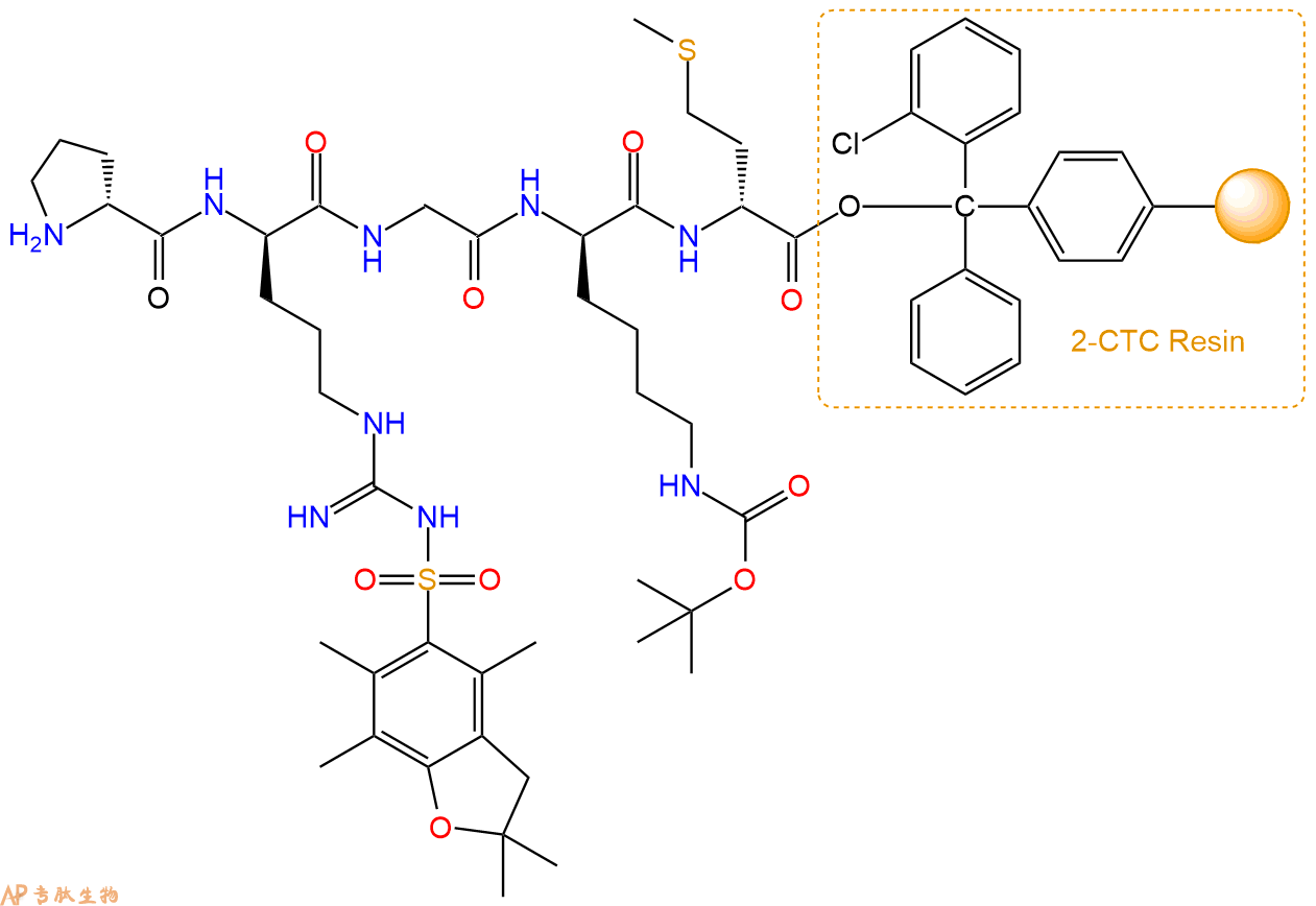 最后再经过步骤二得到 H2N-DPro-DArg(Pbf)-Gly-DLys(Boc)-DMet-CTC Resin,结构如下:
