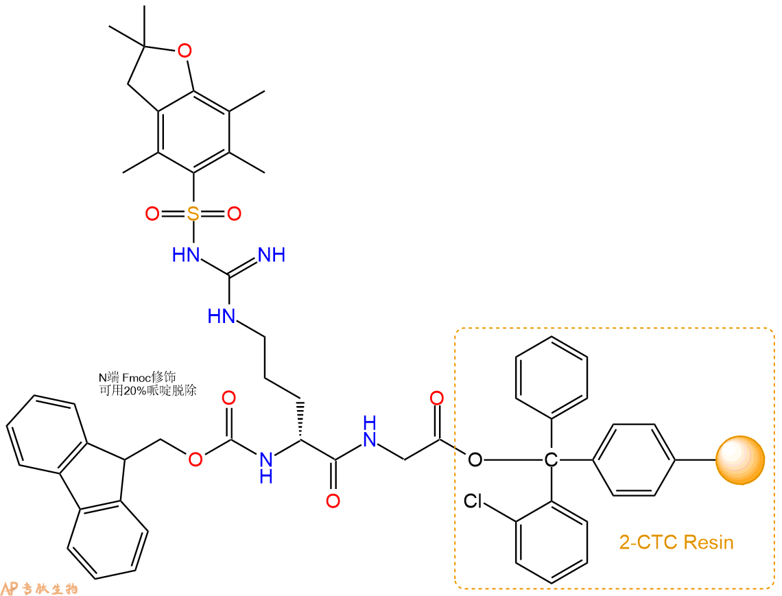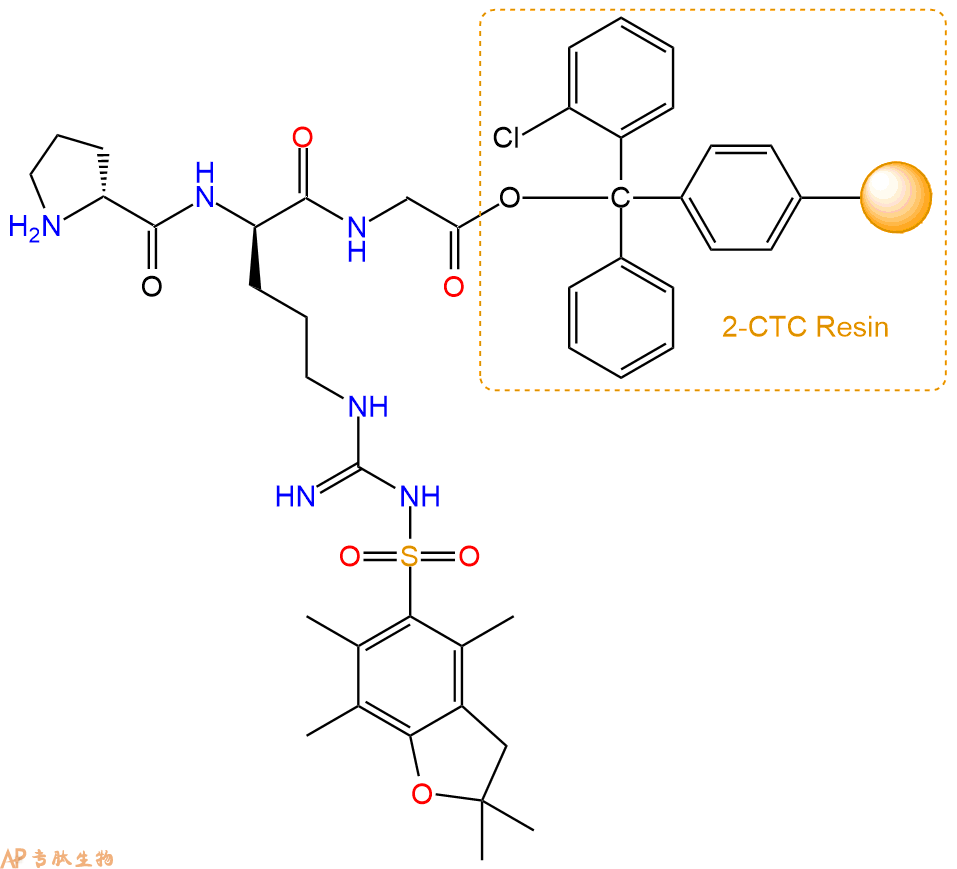 最后再经过步骤二得到 H2N-DPro-DArg(Pbf)-Gly-CTC Resin,结构如下:
