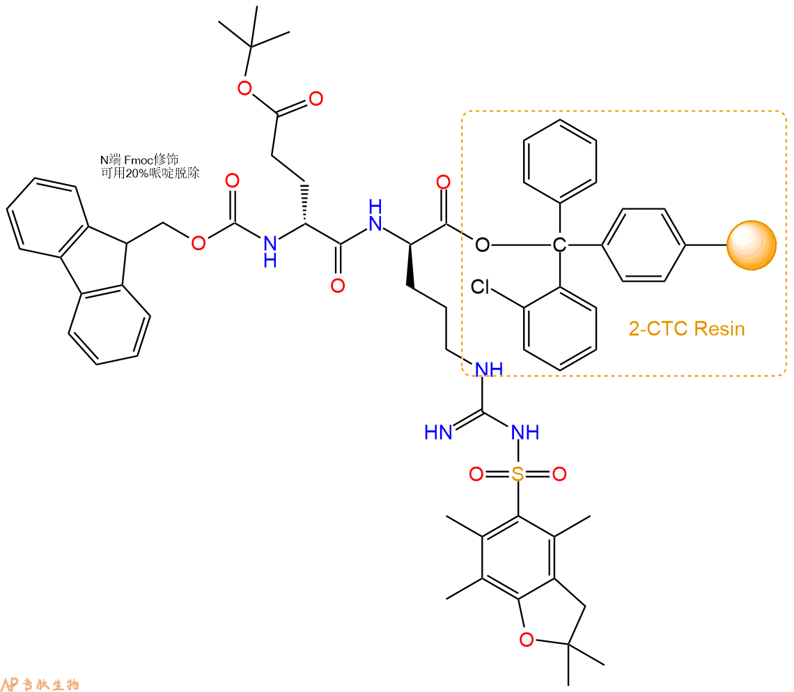1、合成CTC树脂:称取2.25g CTC Resin(如初始取代度约为0.4mmol/g)和1.08mmol Fmoc-DArg(Pbf)-OH于反应器中,加入适量DCM溶解氨基酸(需要注意,此时CTC树脂体积会增大好几倍,避免DCM溶液过少),再加入2.7mmol DIPEA(Mw:129.1,d:0.740g/ml),反应2-3小时后,可不抽滤溶液,直接加入1ml的HPLC级甲醇,封端半小时。依次用DMF洗涤2次,甲醇洗涤1次,DCM洗涤一次,甲醇洗涤一次,DCM洗涤一次,DMF洗涤2次(这里使用甲醇和DCM交替洗涤,是为了更好地去除其他溶质,有利于后续反应)。得到 Fmoc-DArg(Pbf)-CTC Resin。结构图如下:
