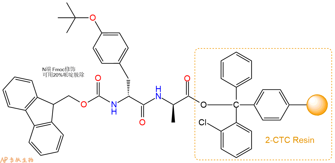 1、合成CTC树脂:称取0.5g CTC Resin(如初始取代度约为0.99mmol/g)和0.59mmol Fmoc-DAla-OH于反应器中,加入适量DCM溶解氨基酸(需要注意,此时CTC树脂体积会增大好几倍,避免DCM溶液过少),再加入1.48mmol DIPEA(Mw:129.1,d:0.740g/ml),反应2-3小时后,可不抽滤溶液,直接加入1ml的HPLC级甲醇,封端半小时。依次用DMF洗涤2次,甲醇洗涤1次,DCM洗涤一次,甲醇洗涤一次,DCM洗涤一次,DMF洗涤2次(这里使用甲醇和DCM交替洗涤,是为了更好地去除其他溶质,有利于后续反应)。得到 Fmoc-DAla-CTC Resin。结构图如下: