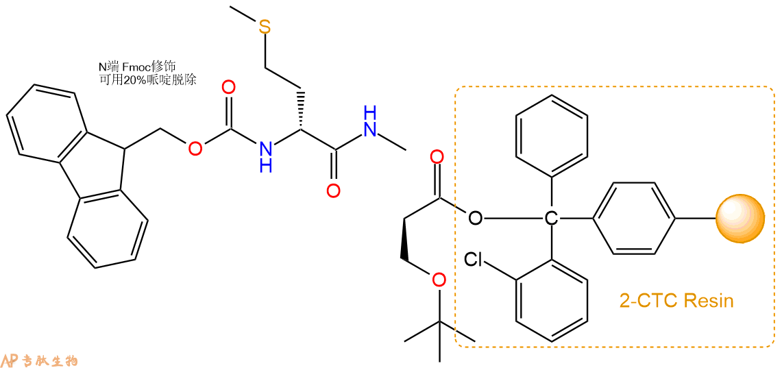 3、缩合:取1.64mmol Fmoc-DMet-OH 氨基酸,加入到上述树脂里,加适当DMF溶解氨基酸,再依次加入3.28mmol DIPEA,1.56mmol HBTU。反应30分钟后,取小样洗涤,茚三酮检测为无色。用2倍树脂体积的DMF 洗涤3次树脂。(洗涤树脂,去掉残留溶剂,为下一步反应做准备)。得到Fmoc-DMet-DSer(tBu)-CTC Resin。氨基酸:DIPEA:HBTU:树脂=3:6:2.85:1(摩尔比)。结构图如下: