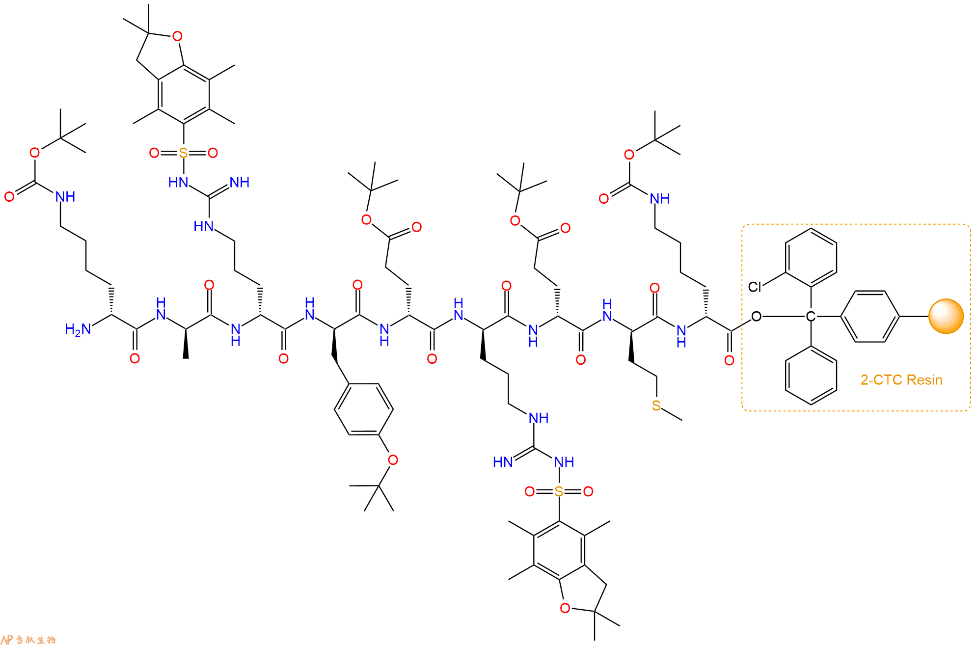 最后再经过步骤二得到 H2N-DLys(Boc)-DAla-DArg(Pbf)-DTyr(tBu)-DGlu(OtBu)-DArg(Pbf)-DGlu(OtBu)-DMet-DLys(Boc)-CTC Resin,结构如下: