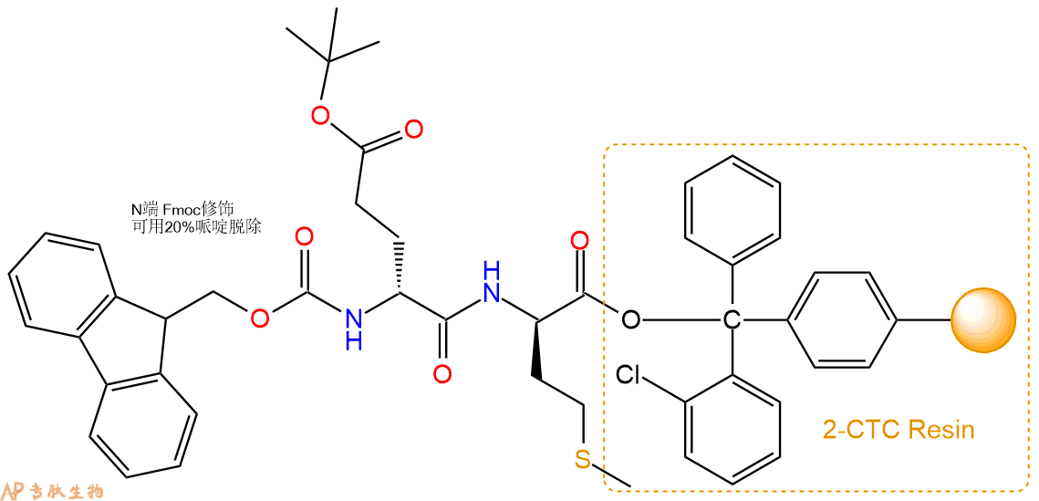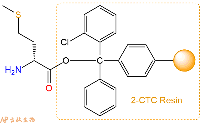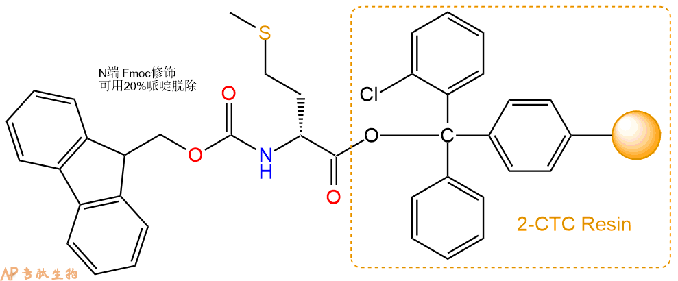 1、合成CTC树脂:称取2.56g CTC Resin(如初始取代度约为1.01mmol/g)和3.1mmol Fmoc-DMet-OH于反应器中,加入适量DCM溶解氨基酸(需要注意,此时CTC树脂体积会增大好几倍,避免DCM溶液过少),再加入7.76mmol DIPEA(Mw:129.1,d:0.740g/ml),反应2-3小时后,可不抽滤溶液,直接加入1ml的HPLC级甲醇,封端半小时。依次用DMF洗涤2次,甲醇洗涤1次,DCM洗涤一次,甲醇洗涤一次,DCM洗涤一次,DMF洗涤2次(这里使用甲醇和DCM交替洗涤,是为了更好地去除其他溶质,有利于后续反应)。得到 Fmoc-DMet-CTC Resin。结构图如下: