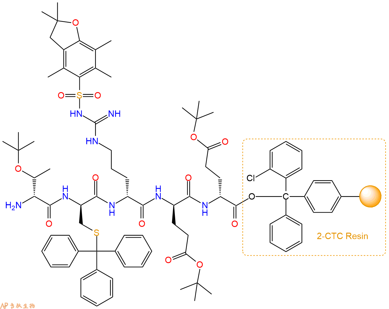 最后再经过步骤二得到 H2N-DThr(tBu)-DCys(Trt)-DArg(Pbf)-DGlu(OtBu)-DGlu(OtBu)-CTC Resin,结构如下: